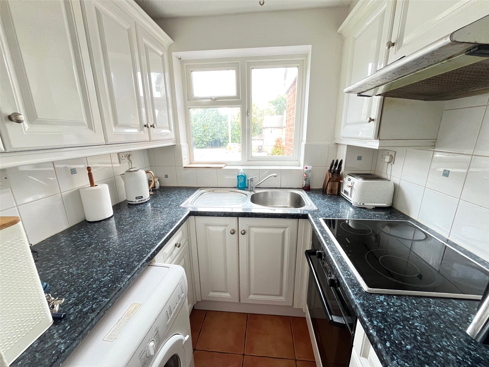 Kitchen 6'6" x 5'6" (1.98m x 1.68m). Fitted with a range of eye and base level units with rolled edge work tops, inset electric oven, ceramic hob with extractor over, stainless steel sink and drainer with mixer tap, space and plumbing for washing machine, ceramic tiled floor, Upvc double glazed window to front aspect.