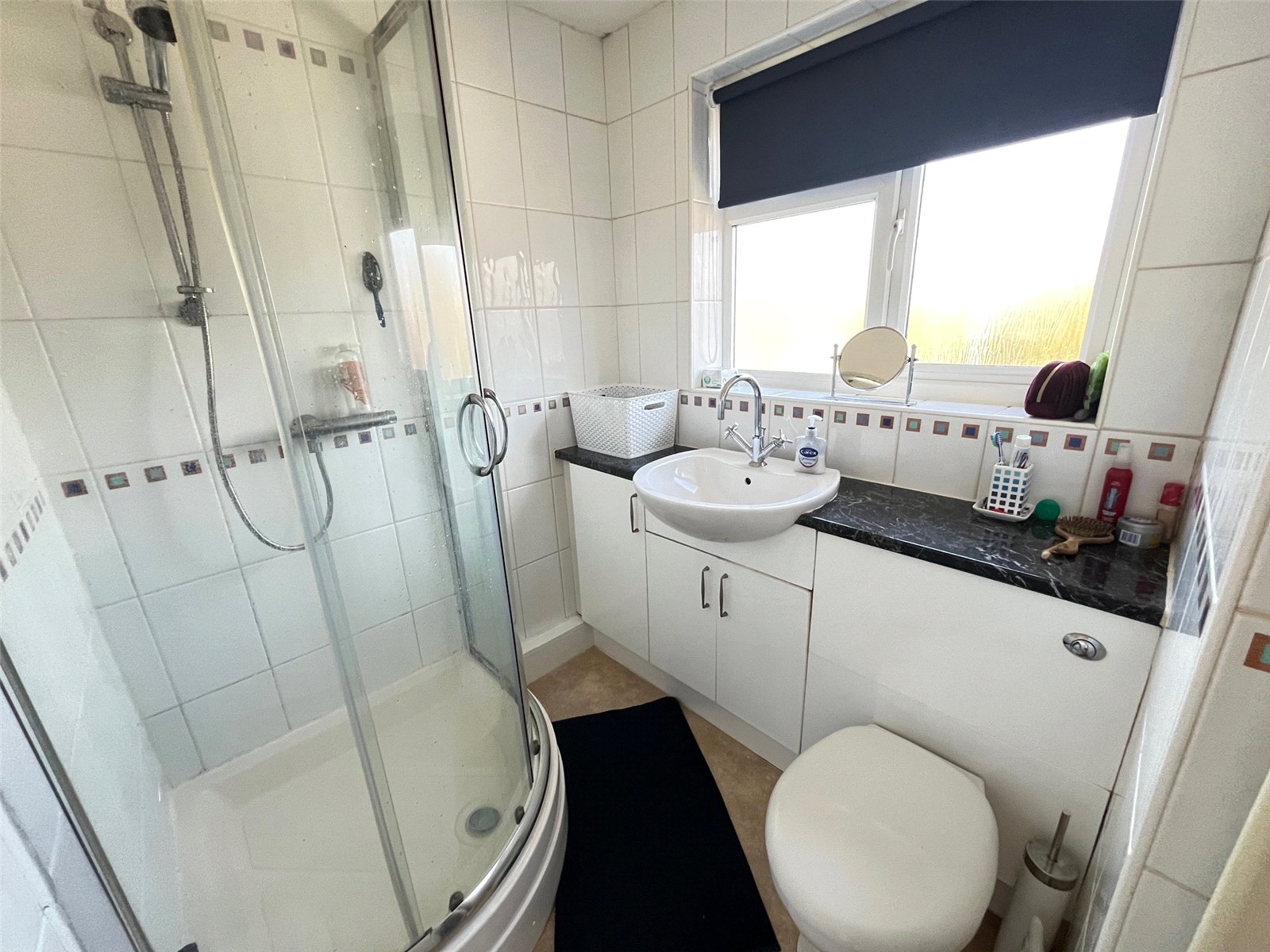 Shower Room 5'6" (1.68m) x 5'6" (1.68m) Plus Door Recess. Fitted with a white three piece suite comprising of concealed unit WC, wash hand basin with mixer to over set into vanity unit, shower cubicle with plumbed in shower, recessed spotlight, full height tiling to all walls, heated towel rail