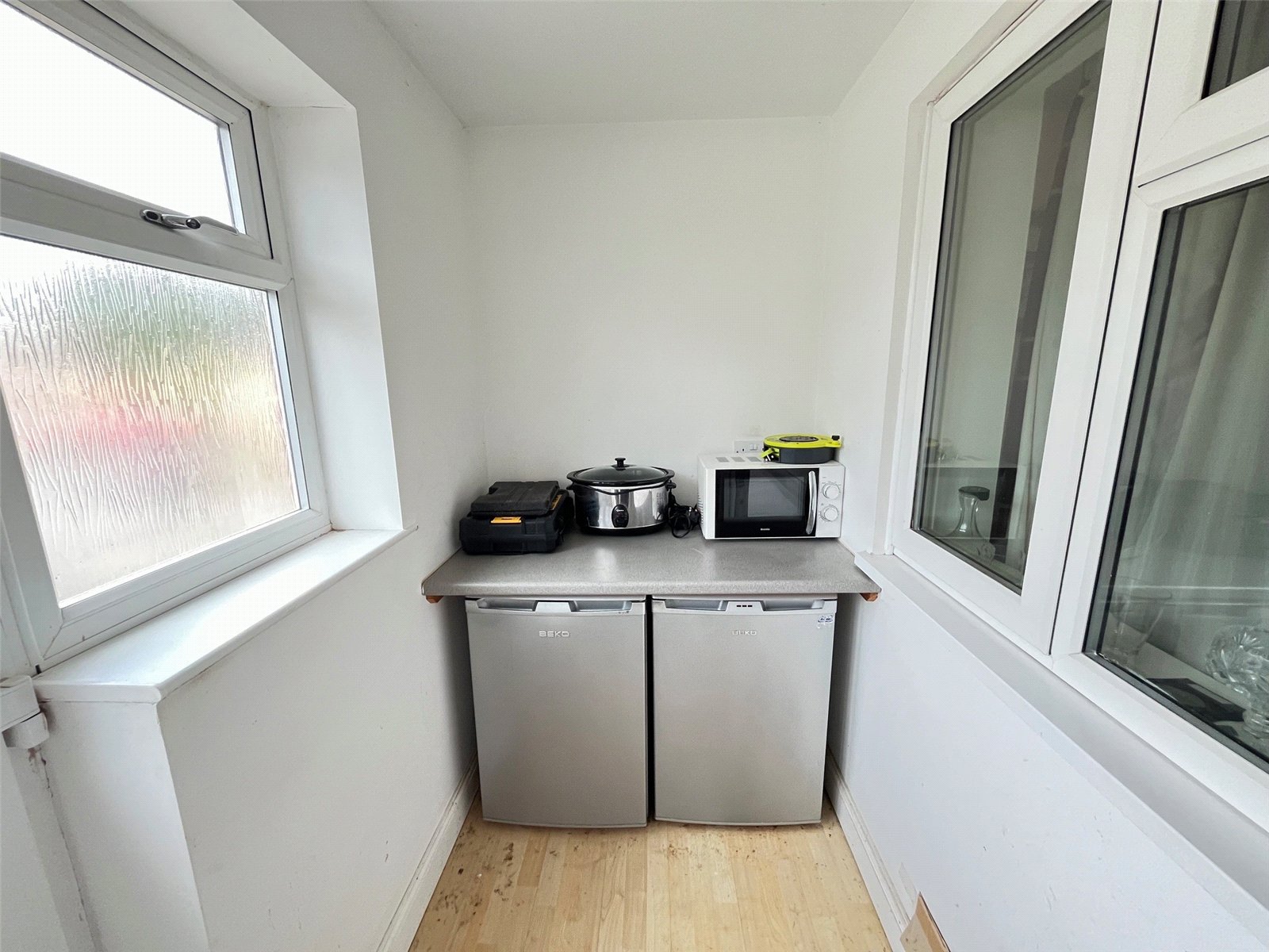 Porch 9'6" x 4'4" (2.9m x 1.32m). A great addition to this property is a spacious porch with wood laminate floor, space for under counter fridge/freezer with rolled edge work surface over, part opaque Upvc double glazed door to :-
