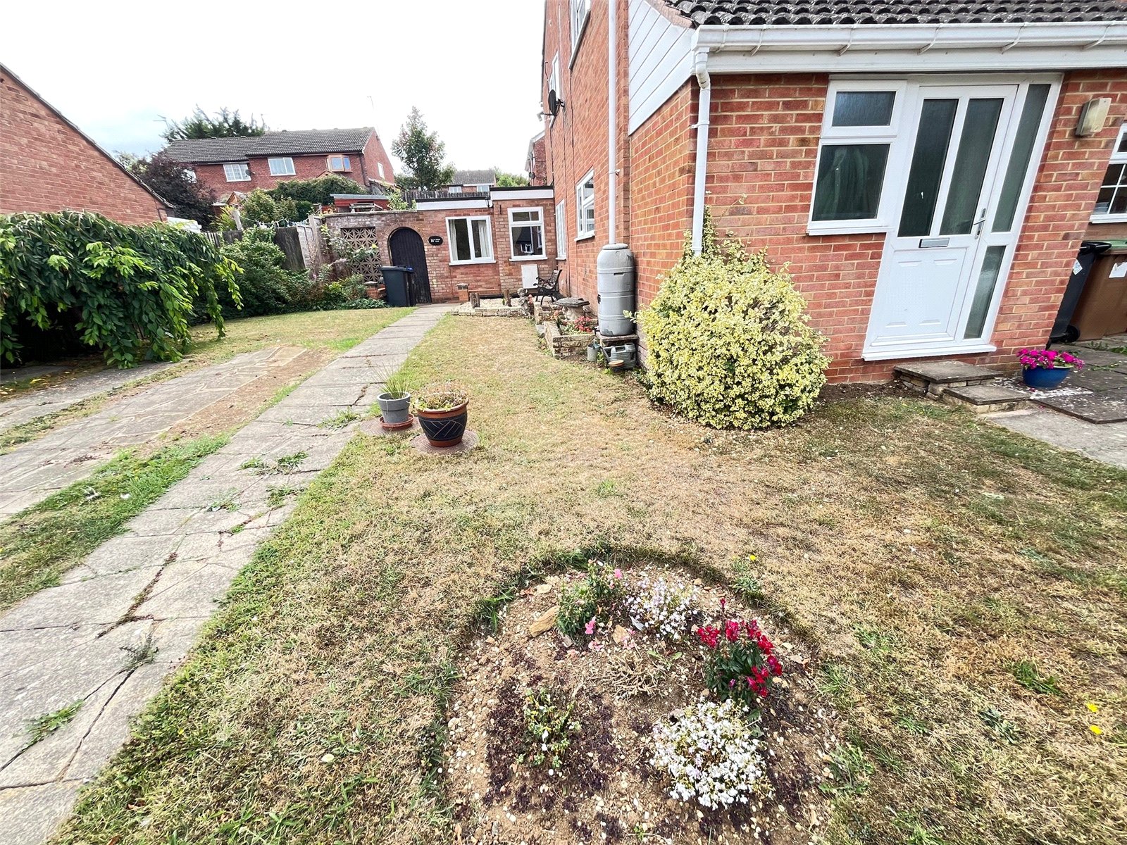 Outside There is a lawn area to the front with a decorative circular bed with shrubs and flowers, pathway to front entrance with outside light, to the side there is a continuation of the lawn area with raised beds with shrubs and flowers. Gravel seating area, the side garden area is currently open but could be enclosed