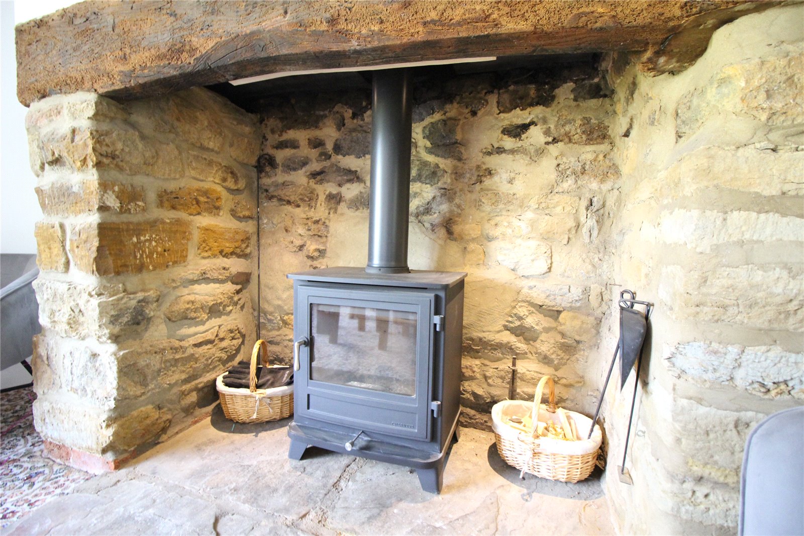 Kitchen 20' (6.1m) x 15'6" (4.72m) (max dimensions). A impressive farm house kitchen again with flagged stone flooring. The focal point of the room is a large stone inglenook with large bressummer beam and free standing Stanley Waterford solid fuel range. The inglenook itself has exposed stonework and display/storage shelving of quarry tile, window to front aspect with window seat and low level radiator, added character is given to the room with a large exposed beam to ceiling, large walk-in pantry, door giving access to a secondary set of stairs, two walkways through to the utility room.
