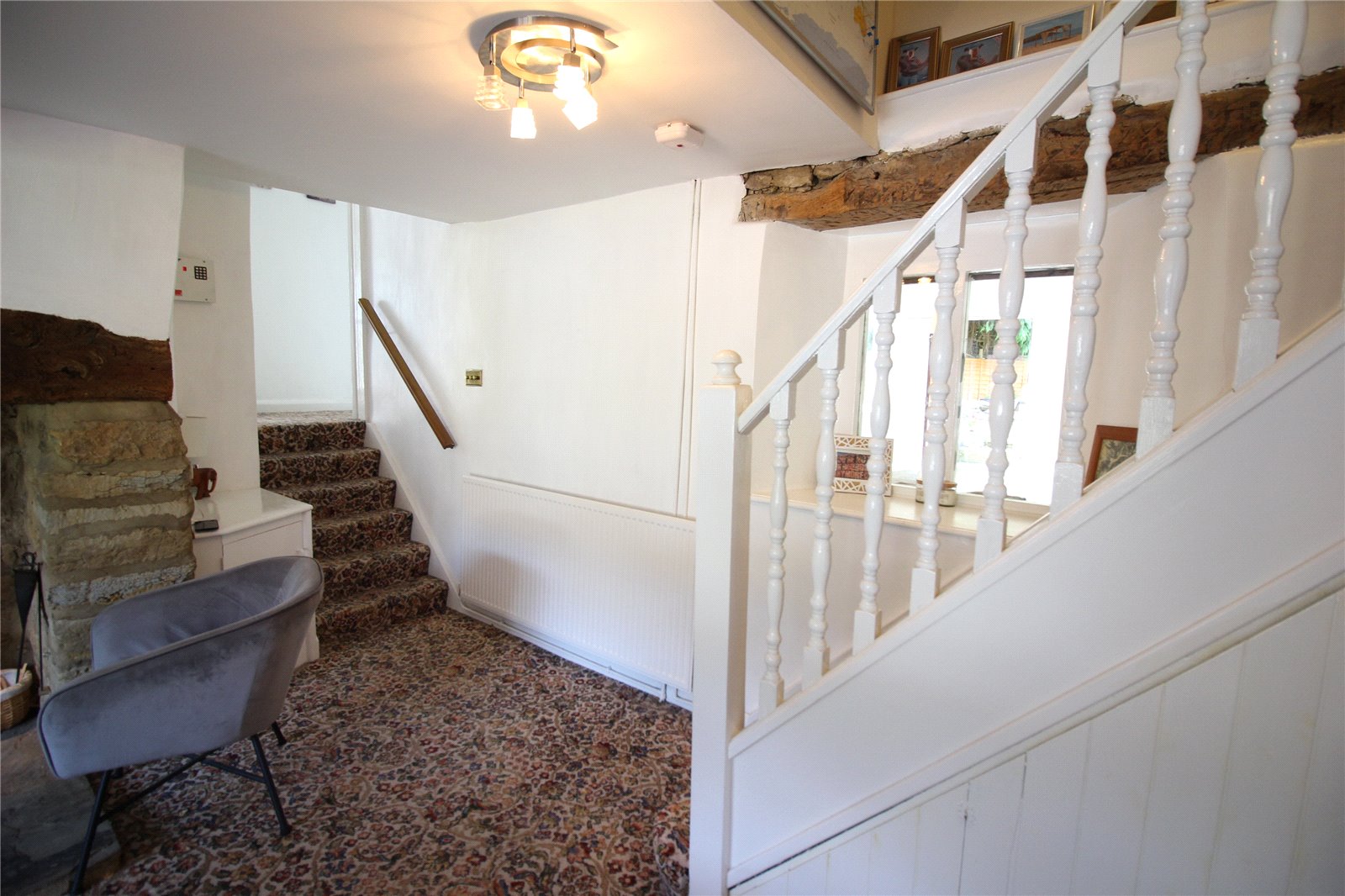 Dining Room 15'6" x 15'5" (4.72m x 4.7m). A spacious room once again full of charm and character with exposed beams and timbers. The main focal point of the room is a large stone fireplace with cast log burner which is set onto a flagged stone hearth with bressummer beam over, window to front aspect with timber beam over, single panel radiator. The room has two staircases one leading to the first floor and the second to a half height landing which gives access to two further reception rooms.