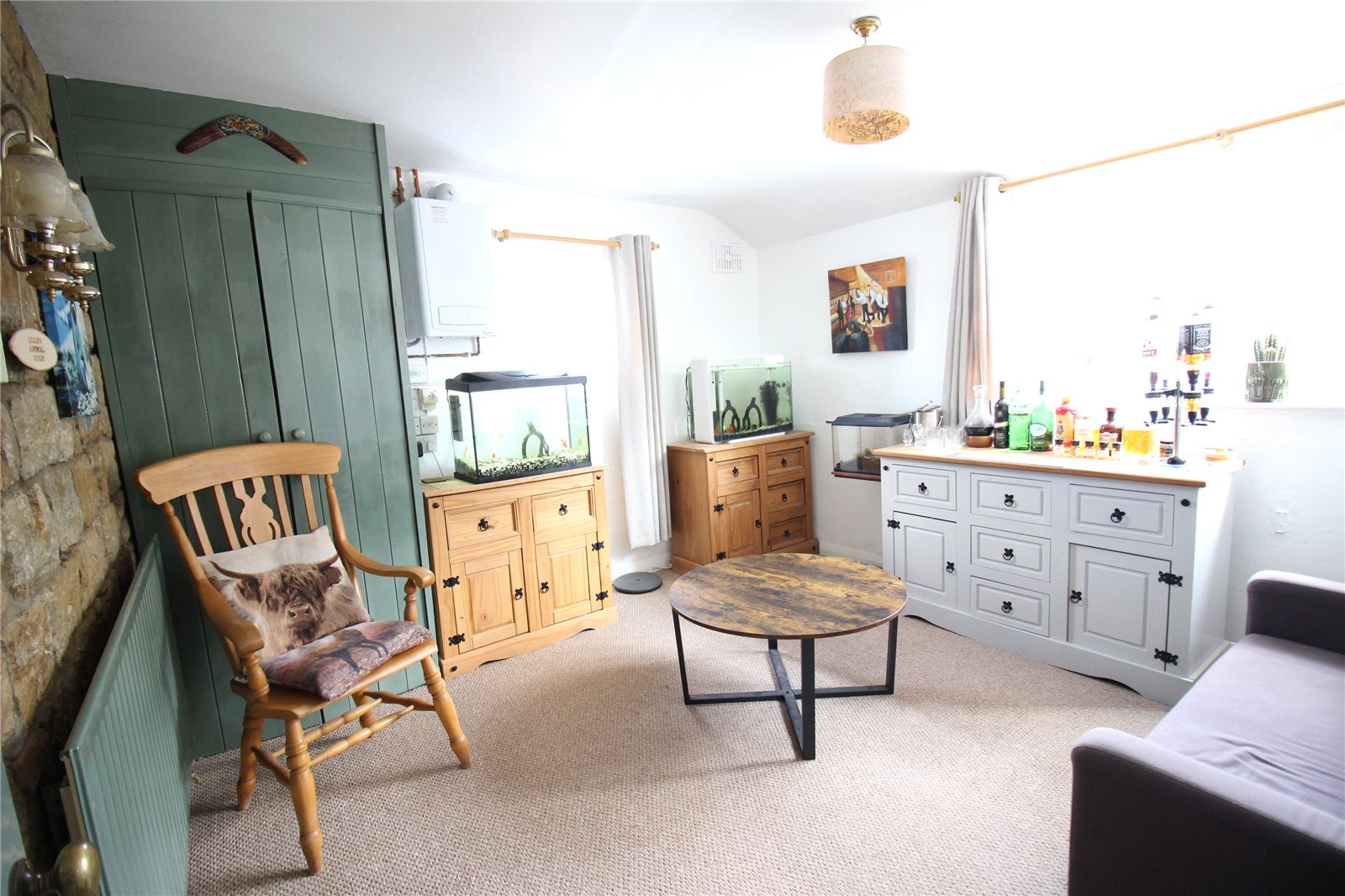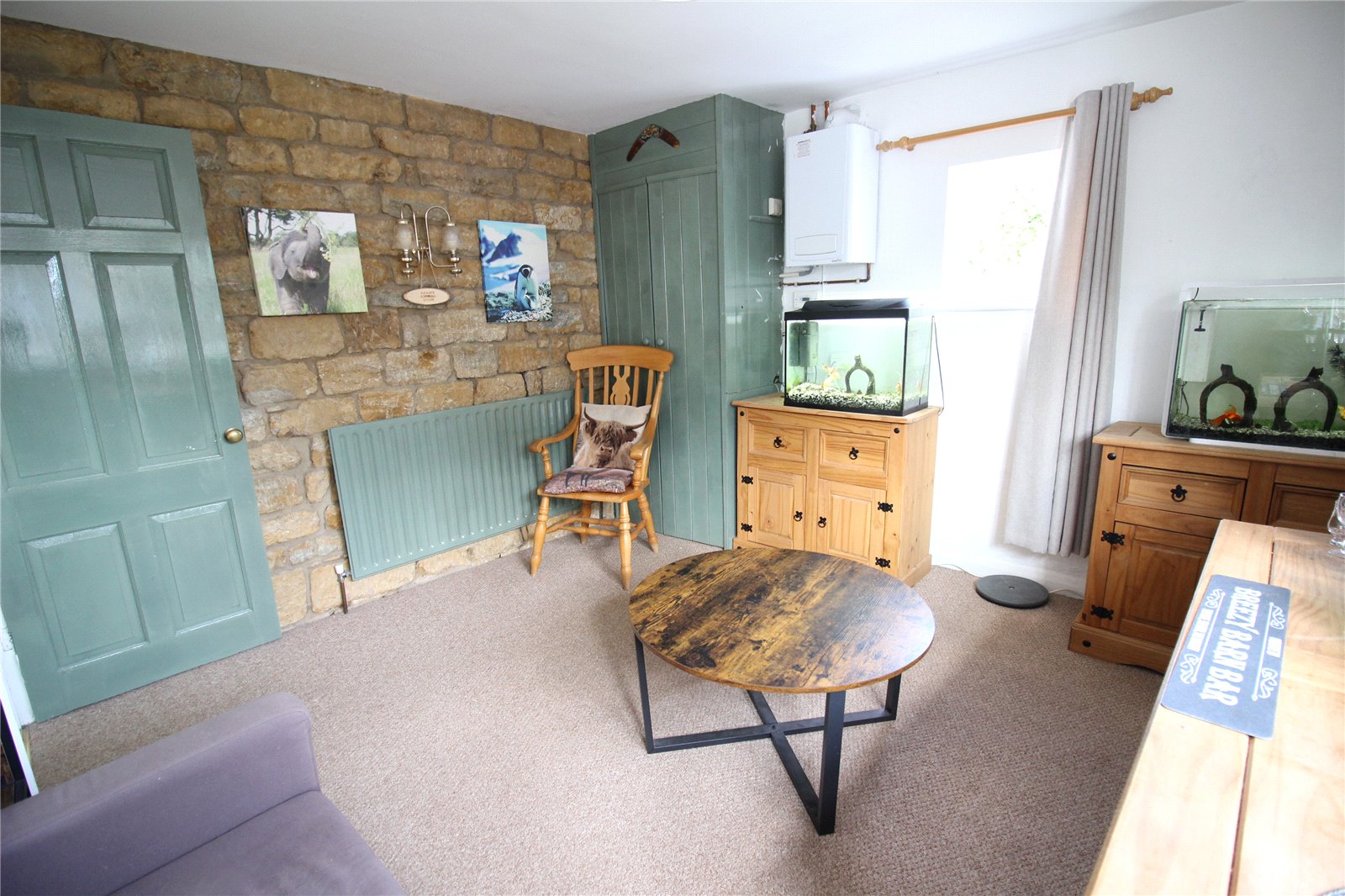 Reception Three / Study 11'9" x 11'4" (3.58m x 3.45m). A third reception room which can be used for a multiple of purposes making an ideal study, snug or second sitting room. One wall is exposed stone giving added character, windows to front and side aspects, built in cupboard to one corner, wall mounted British Gas boiler, single panel radiator.