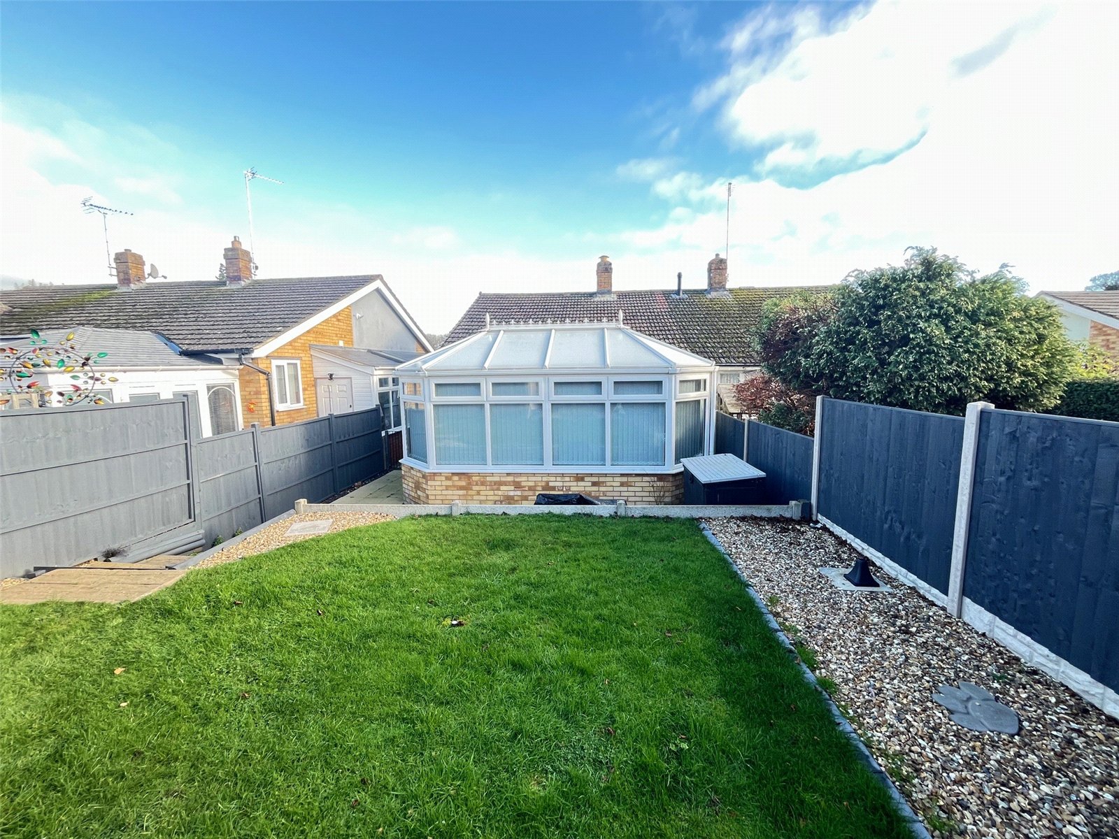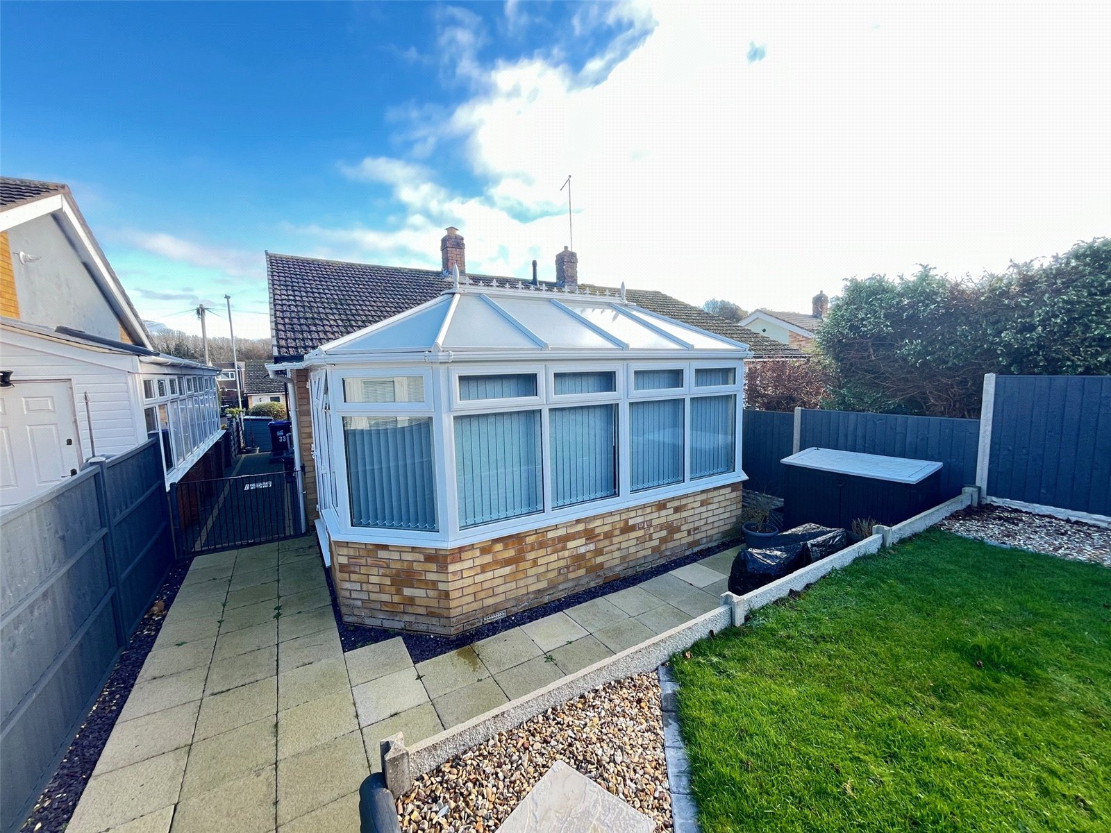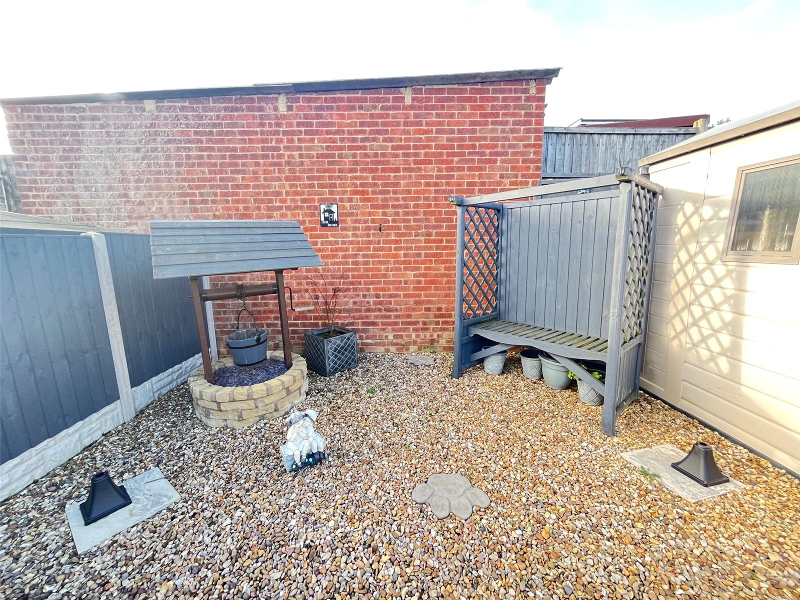 Front A delightful and welcoming frontage with pathway access via wooden gate with pathway to paved seating area, lawn area with shrubs and flower borders, outside light, steps to front entrance, enclosed by low level timber fencing with decorative trellis top