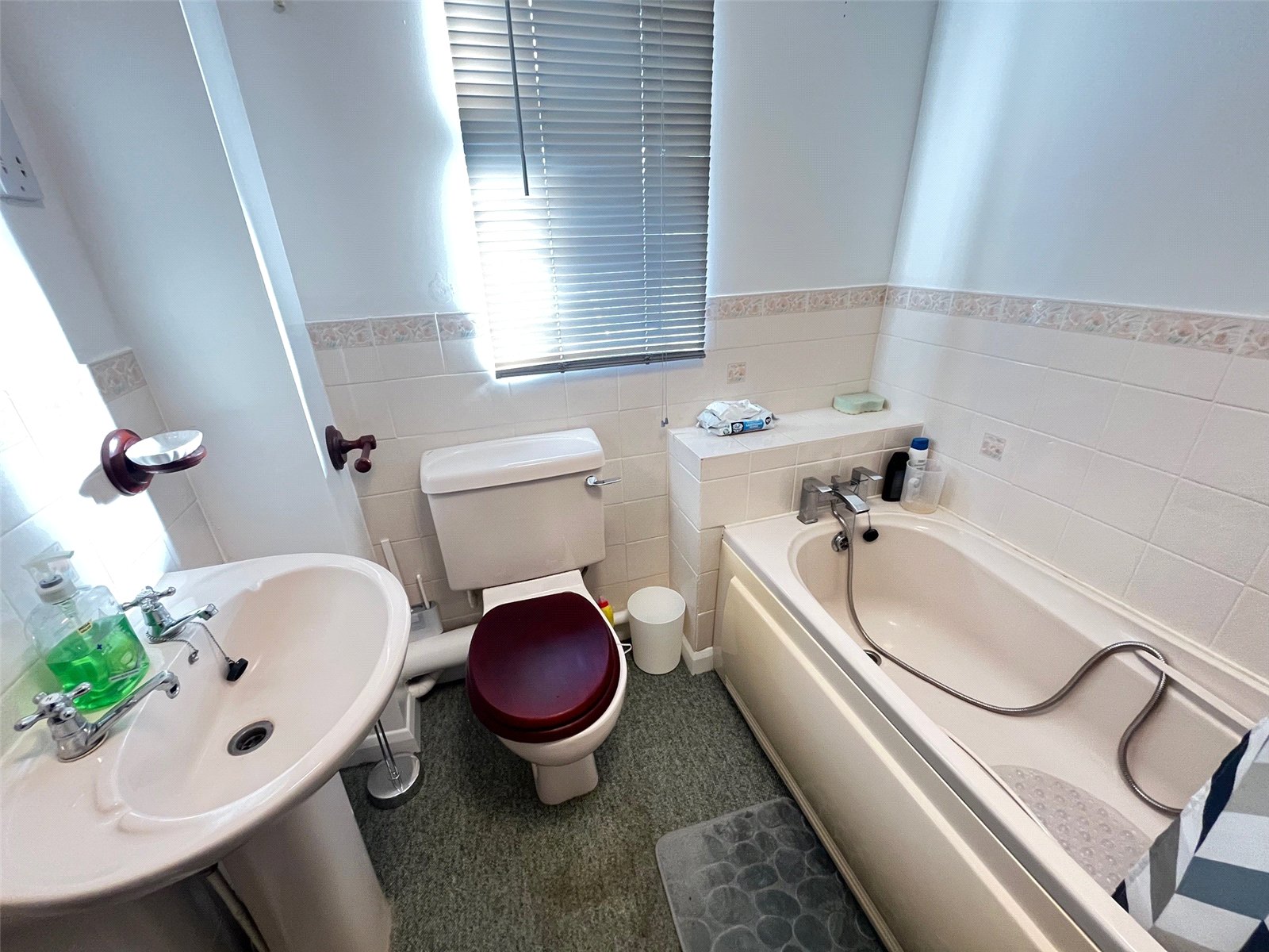 Bathroom 6'1" x 5'9" (1.85m x 1.75m). Fitted with a cream three piece suite comprising panel bath, low level WC and pedestal wash hand basin, tiling to water sensitive areas, frosted Upvc double glazed window to side aspect, extractor fan, single panel radiator.