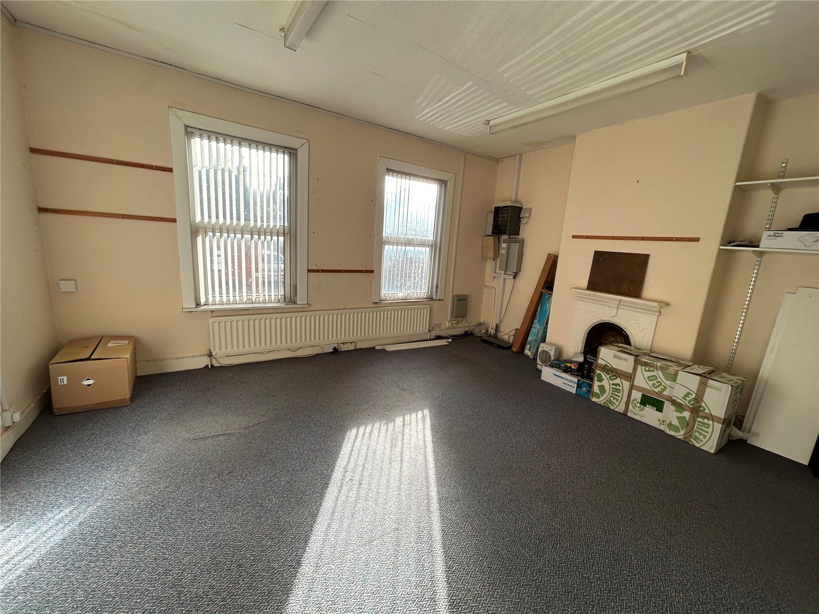 Store Room One 15' x 13' (4.57m x 3.96m). Two windows to front aspect, fireplace, shelving, radiator.