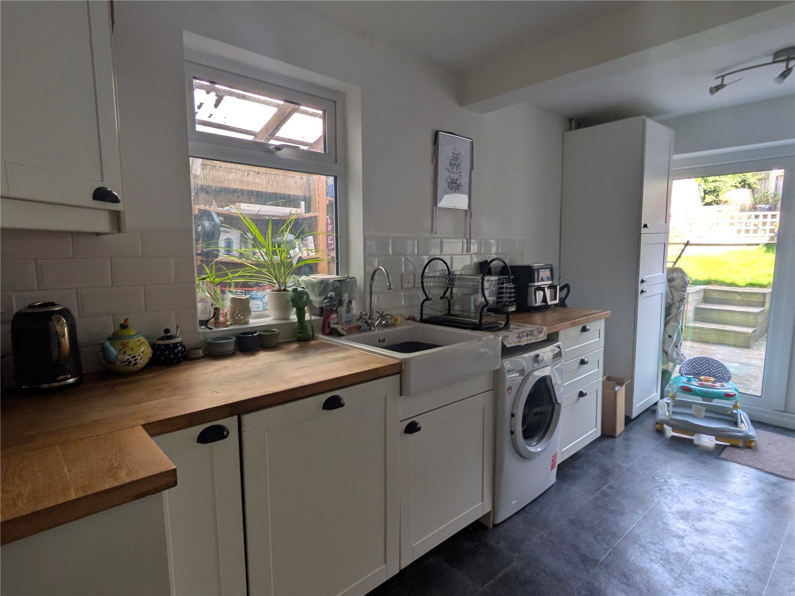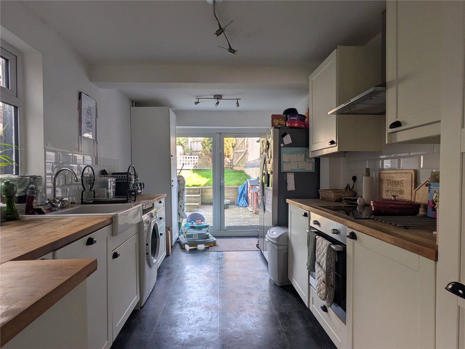 Kitchen 15'3" x 8'10" (4.65m x 2.7m). Fitted with a range of eye and base level units with wooden work surfaces over, single bowl porcelain sink with swan neck mixer tap over, electric hob with extractor over and electric oven under, integrated dishwasher, space and plumbing for washing machine, space for American style fridge freezer, two larder style units one housing the ?Potterton? gas combination boiler, tiling to all water sensitive areas, linoleum tile effect flooring, Upvc double glazed window to side aspect, Upvc double glazed double doors leading to rear garden