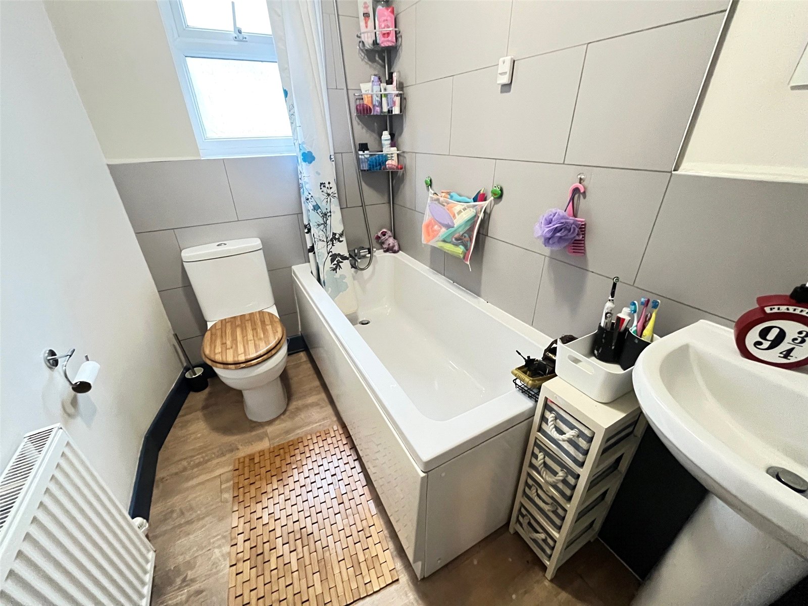 Bathroom 7'4" x 4'8" (2.24m x 1.42m). Fitted with a white three piece suite comprising of low level WC, pedestal wash hand basin with mixer tap over, panel bath with mixer tap over and shower attachment, tiling to water sensitive areas, radiator, opaque Upvc double glazed window to rear aspect, wood laminate floor