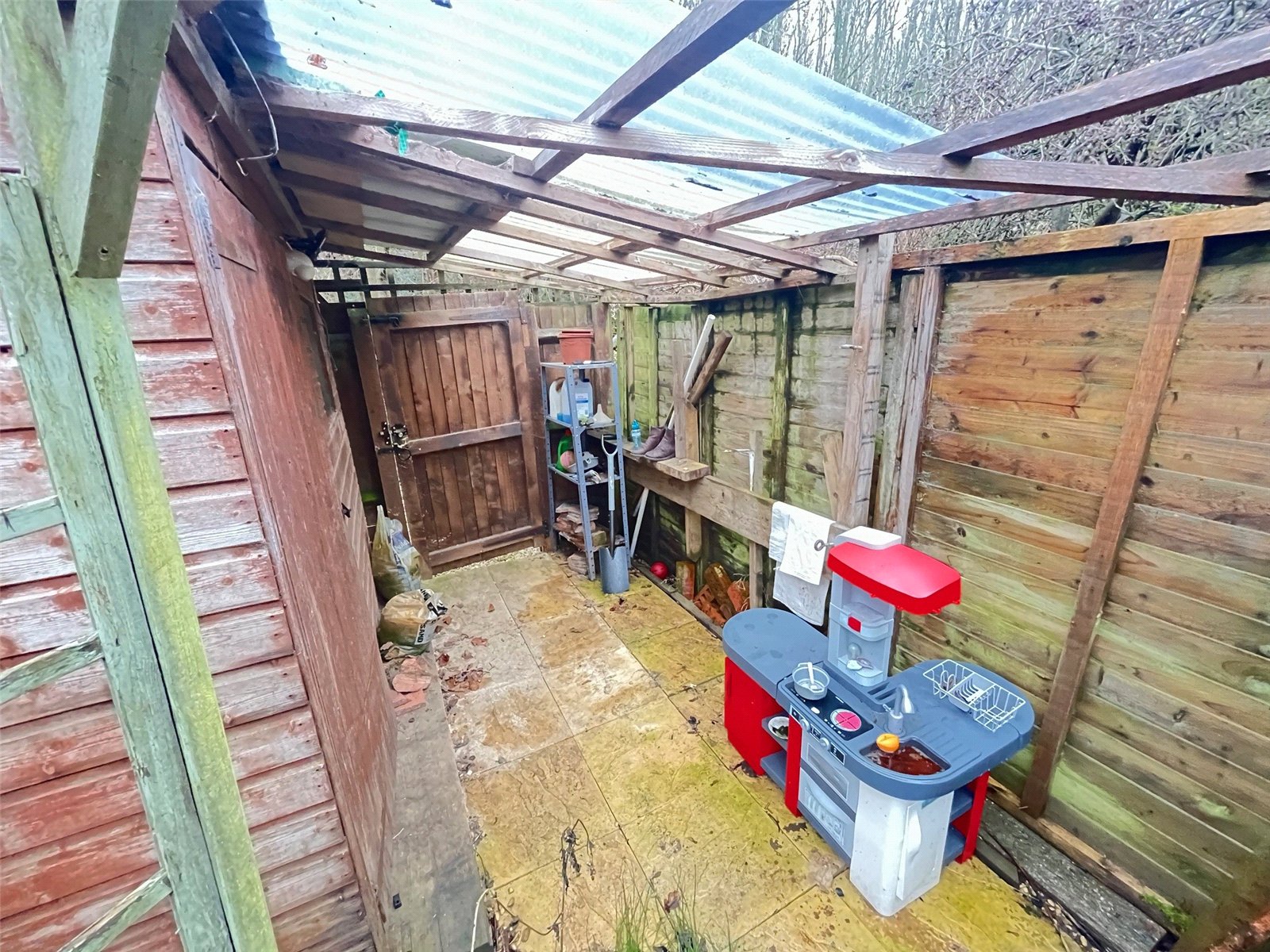 Rear A small covered seating area with wooden Parquet style flooring, step down to a patio area with a herringbone style paving, step down to a further patio area for seating, small lawned area, gated access to side, hardstanding at the bottom of the garden where there is a timber shed with power and light connected. Gated access to rear leading to two parking spaces.