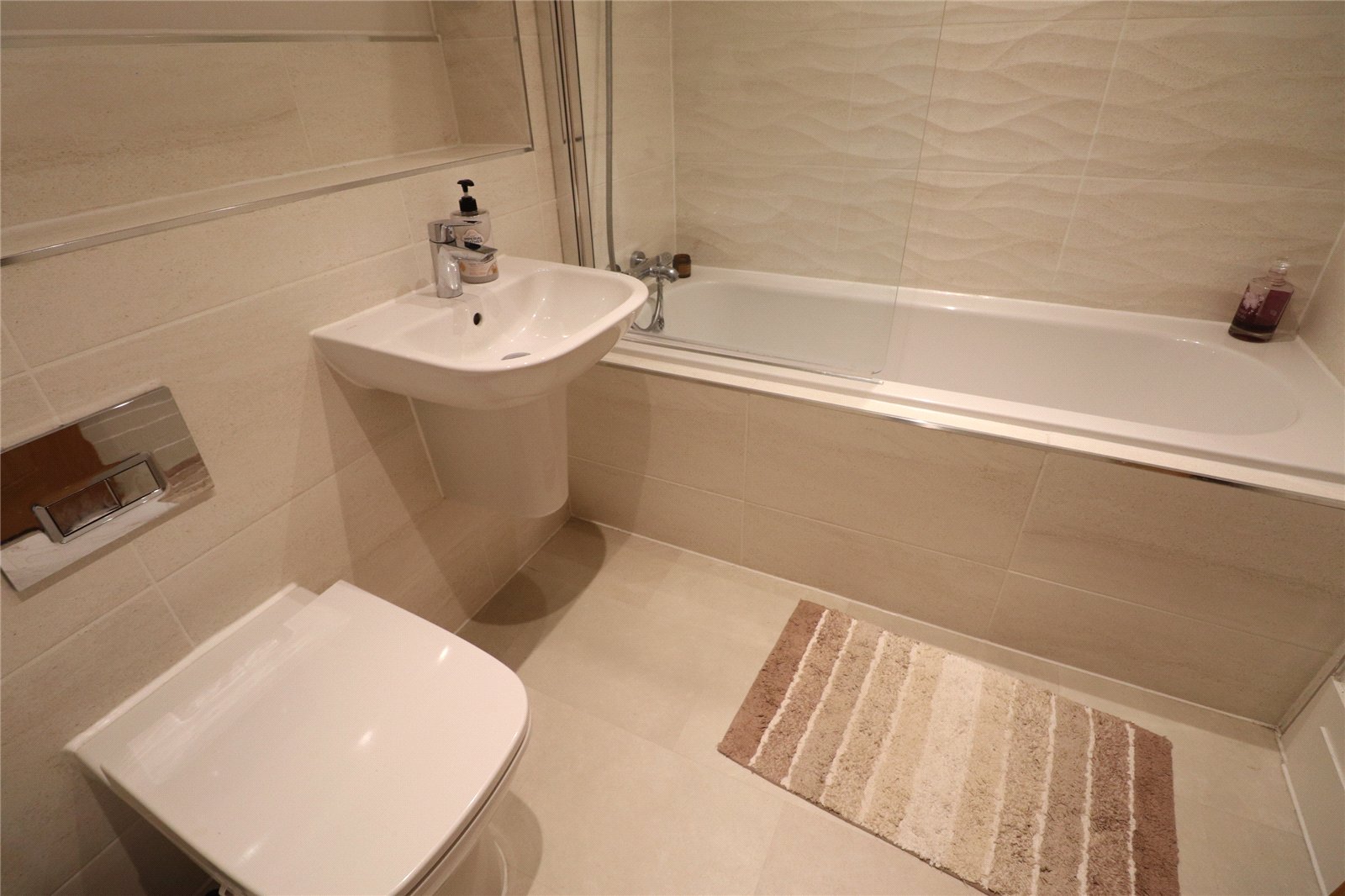 Bathroom 7'2" x 6'2" (2.18m x 1.88m). A modern white three piece suite comprising of a concealed unit WC, contemporary wall mounted wash hand basin with mixer tap over, panel bath with mixer tap and shower attachment and shower screen, chrome heated towel rail, recessed spotlights, extractor, tiling to water sensitive areas, electric shaver point