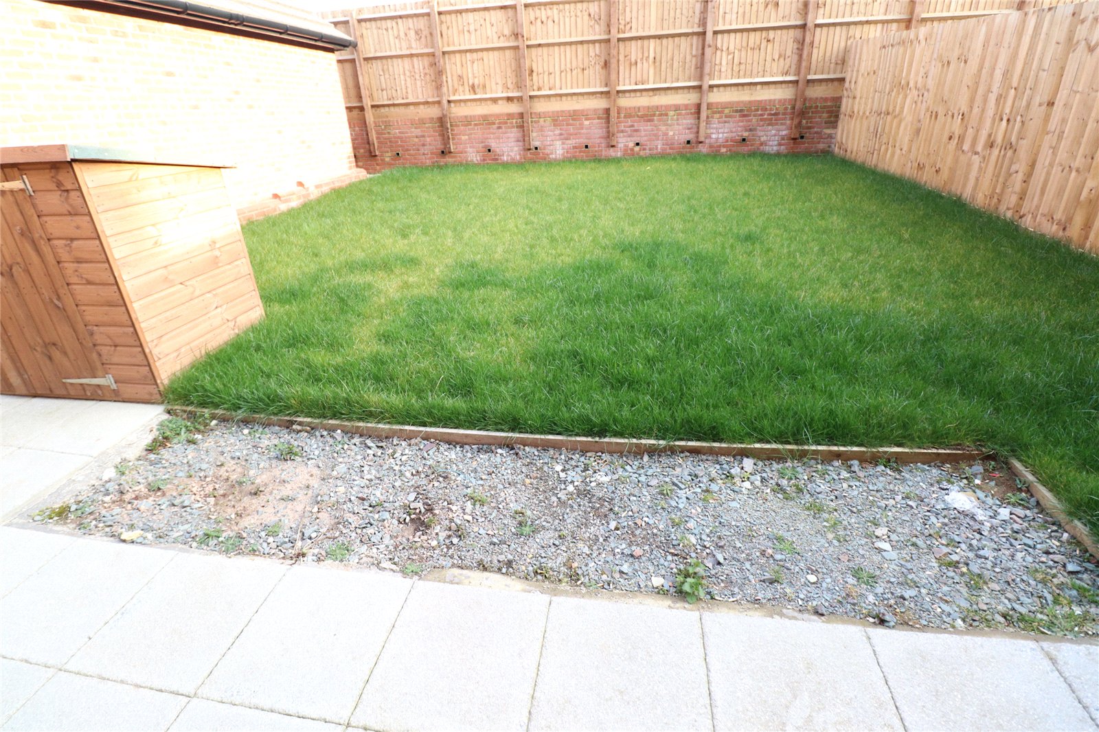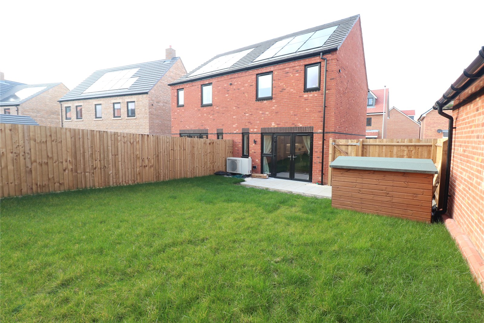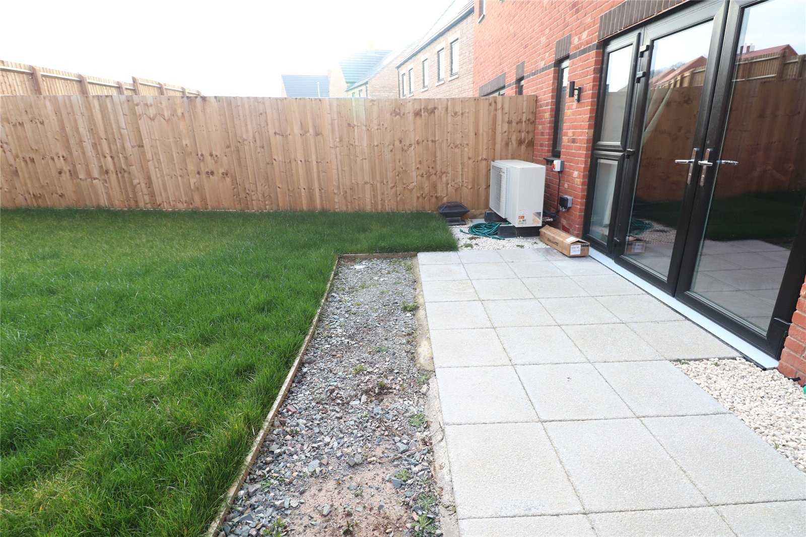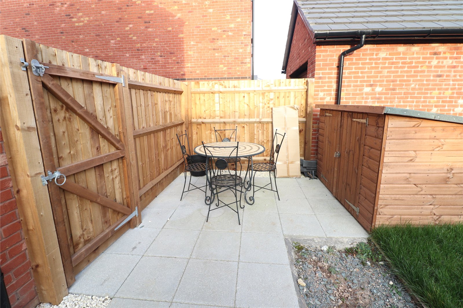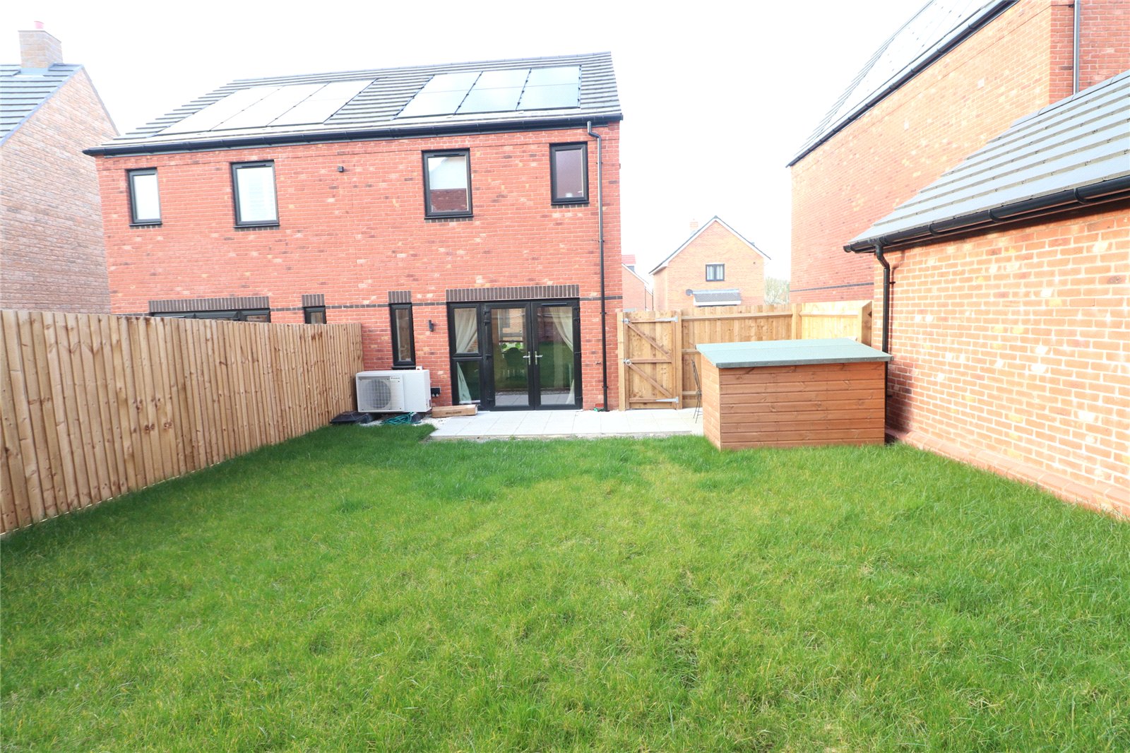 Rear A southerly facing rear garden which benefits from not being overlooked, paved patio area, lawn area, outside tap, delightful patio seating area, hard standing for wooden shed, gated access to front and drive way, floor mounted air source heat pump, outside lighting, external power point, EV charging point. Garden is enclosed by timber fencing and brick wall