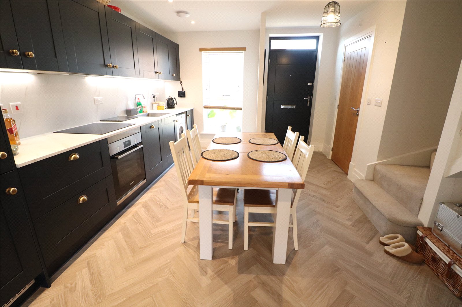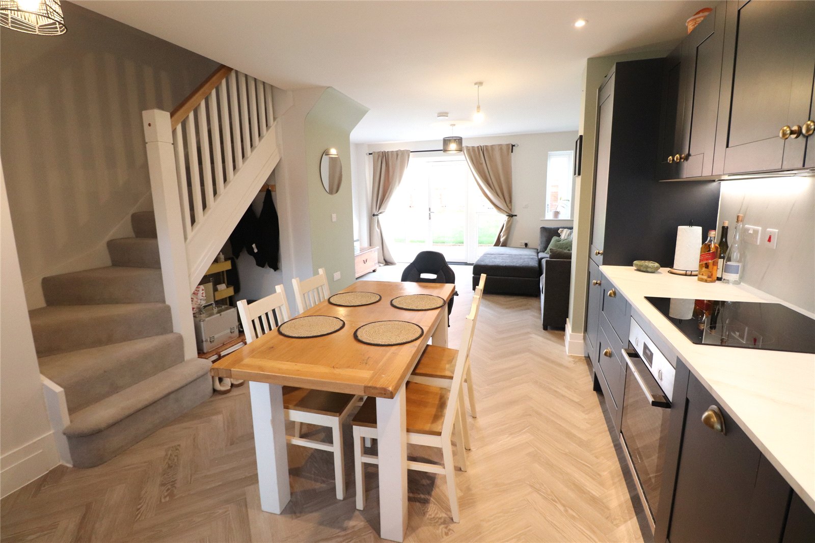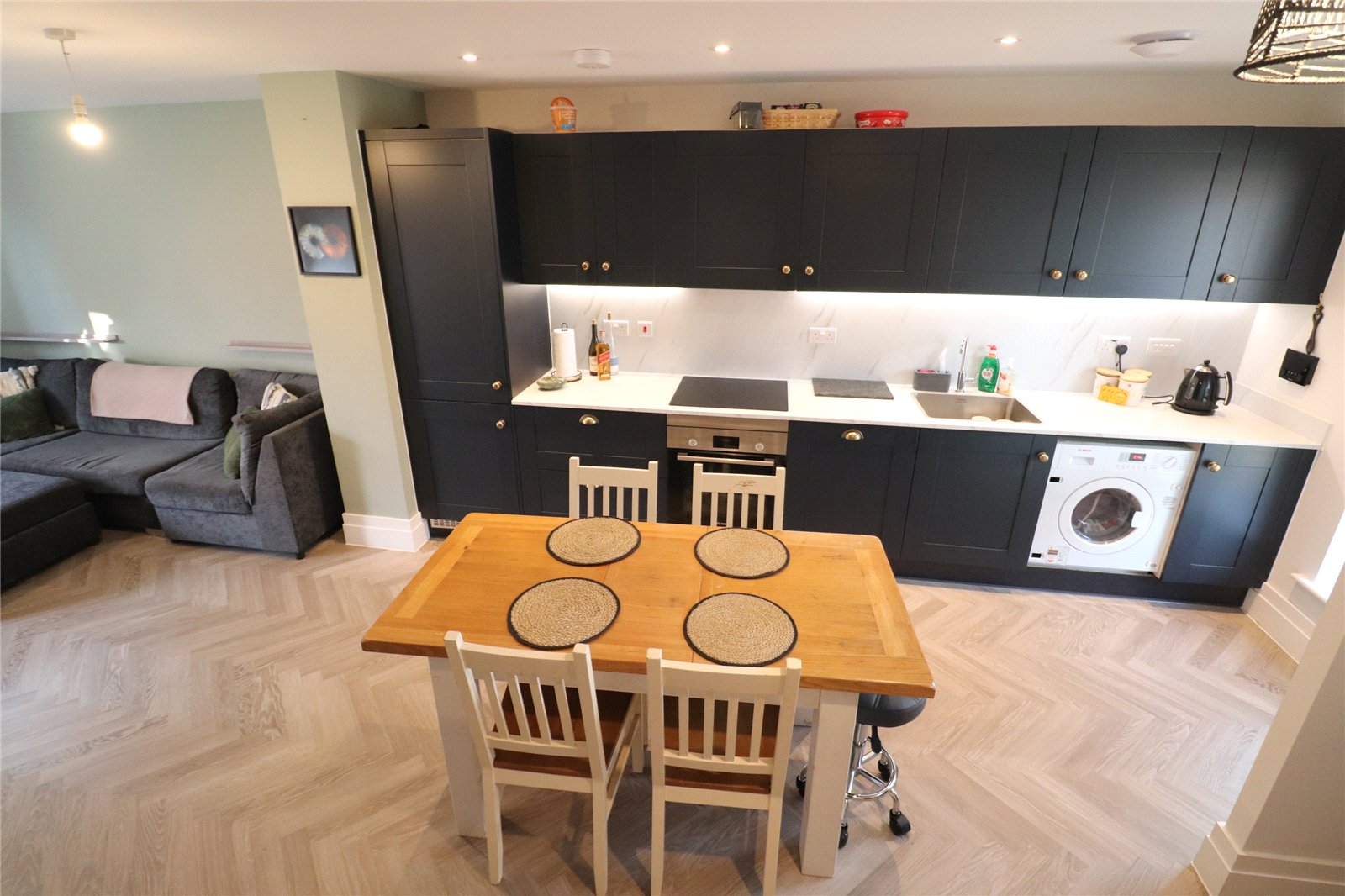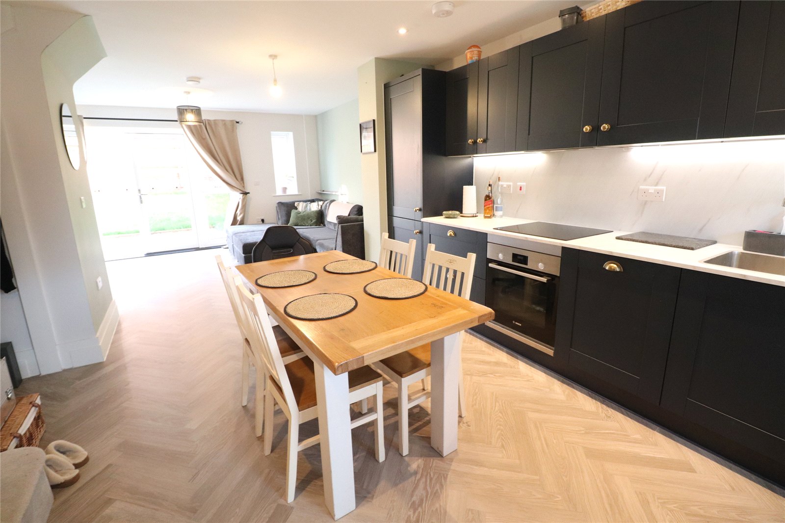 Open Plan Living/Kitchen Area 28'4" x 14'4" (8.64m x 4.37m). The kitchen area is fitted with a range of eye and base level units with worksurfaces over, inset electric oven, ceramic hob and extractor over, waterproof panels to one wall, herringbone wood laminate flooring, inset stainless steel sink unit with mixer tap over, inset washing machine, built in fridge/freezer, built in dishwasher, drawer stack, recessed spotlights, extractor, Upvc double glazed window to front aspect, thermostat control, door to WC, under stairs storage area and leads to living area. A delightful area with a continuation of the herringbone flooring, storage cupboard, media point with television point, satellite television point, radio point and ethernet point, Upvc double glazed window to rear aspect, Upvc double glazed French doors opening onto patio of the rear garden, under floor heating via air source heat pump