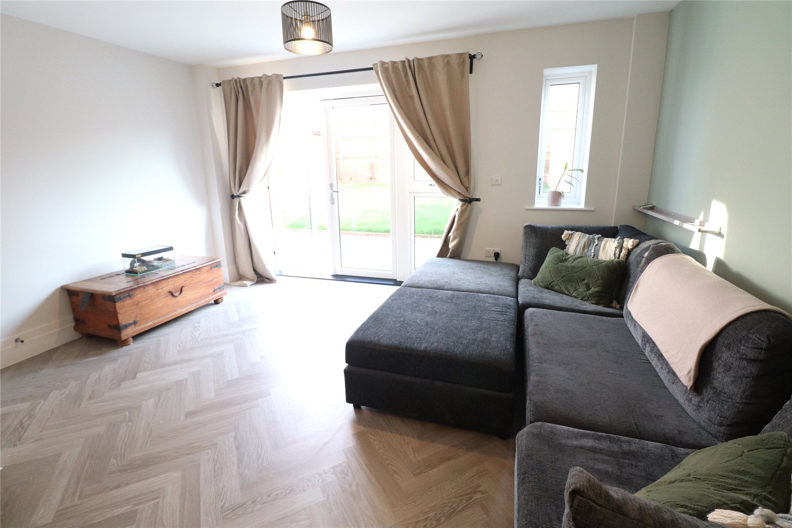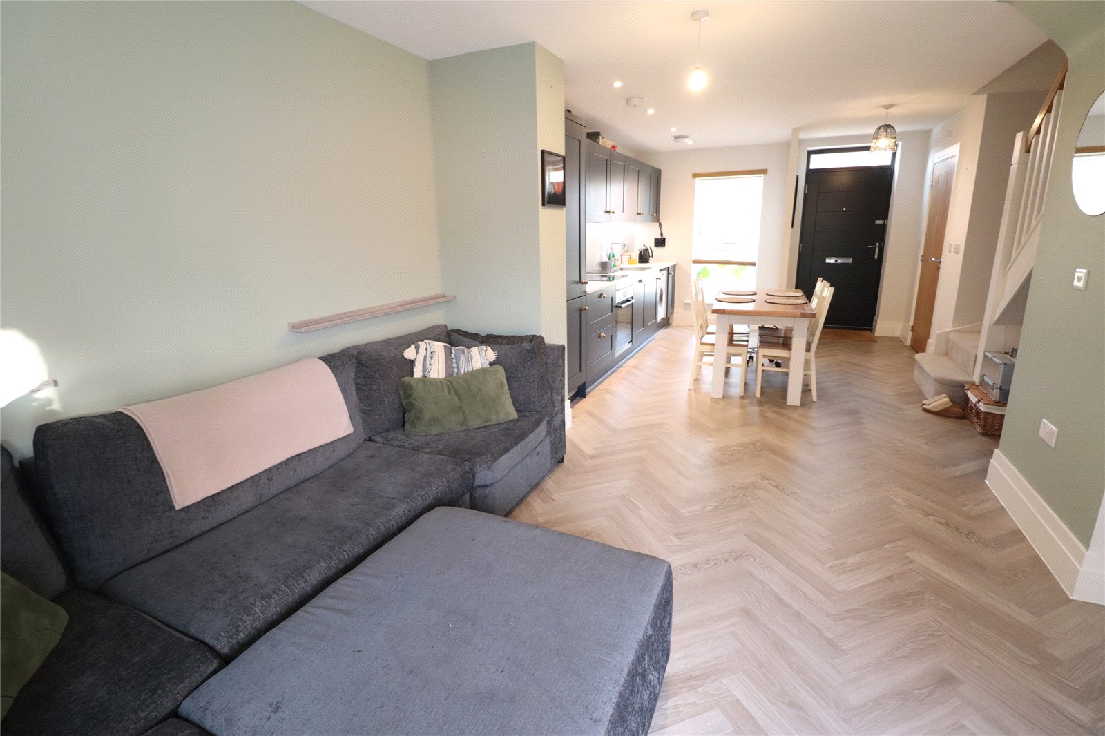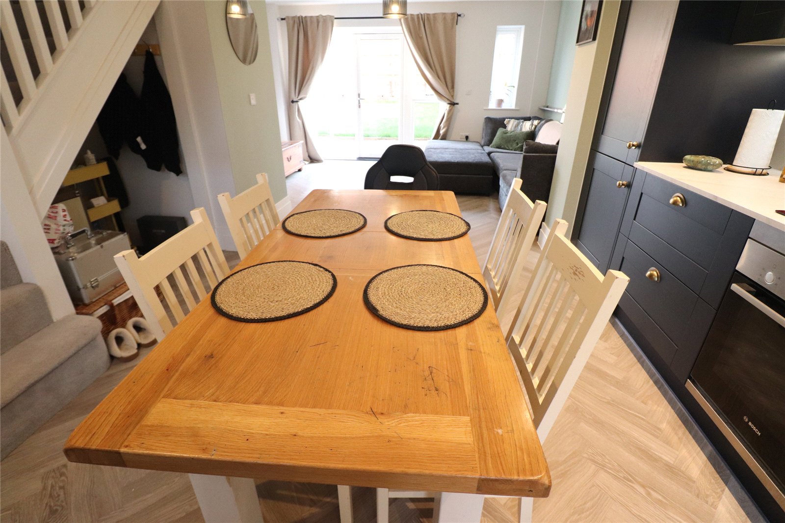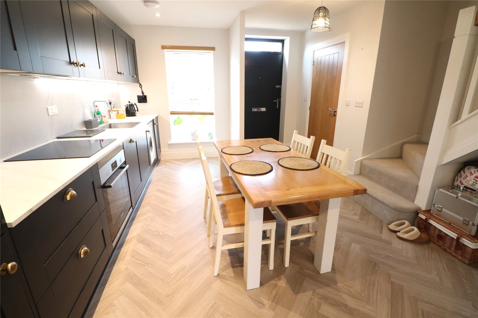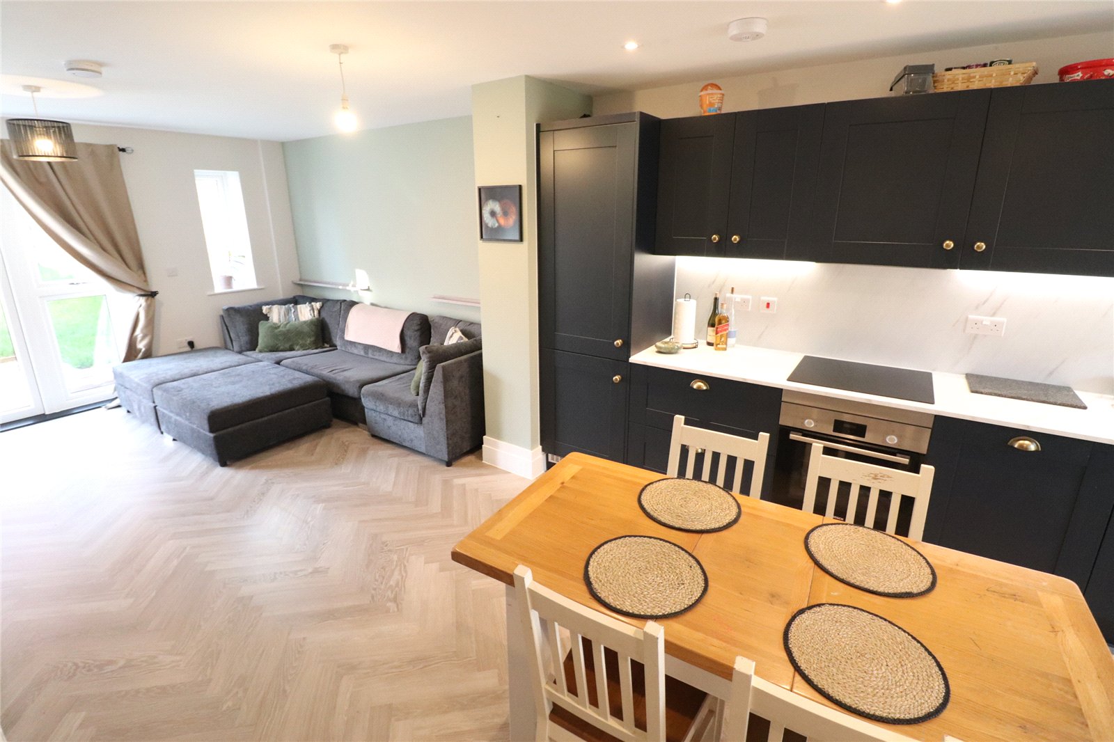 Open Plan Living/Kitchen Area 28'4" x 14'4" (8.64m x 4.37m). The kitchen area is fitted with a range of eye and base level units with worksurfaces over, inset electric oven, ceramic hob and extractor over, waterproof panels to one wall, herringbone wood laminate flooring, inset stainless steel sink unit with mixer tap over, inset washing machine, built in fridge/freezer, built in dishwasher, drawer stack, recessed spotlights, extractor, Upvc double glazed window to front aspect, thermostat control, door to WC, under stairs storage area and leads to living area. A delightful area with a continuation of the herringbone flooring, storage cupboard, media point with television point, satellite television point, radio point and ethernet point, Upvc double glazed window to rear aspect, Upvc double glazed French doors opening onto patio of the rear garden, under floor heating via air source heat pump