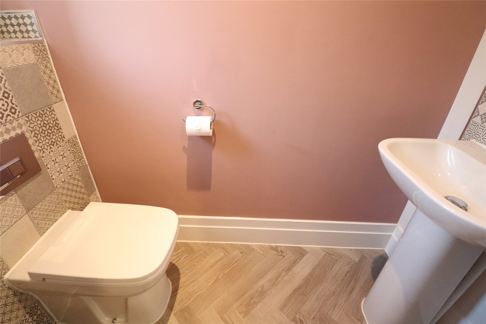 WC 5'8" x 2'10" (1.73m x 0.86m). A lovely fitted two piece suite comprising of a concealed unit WC with ornate tiling, pedestal wash hand basin with mixer tap with ornate tiling splashback, extractor, recessed spotlights, opaque Upvc double glazed window to front aspect, under floor heating