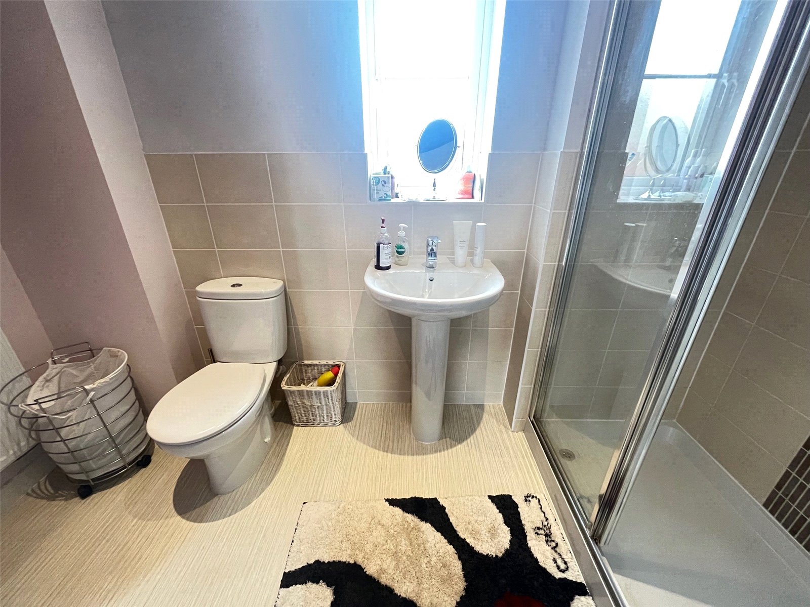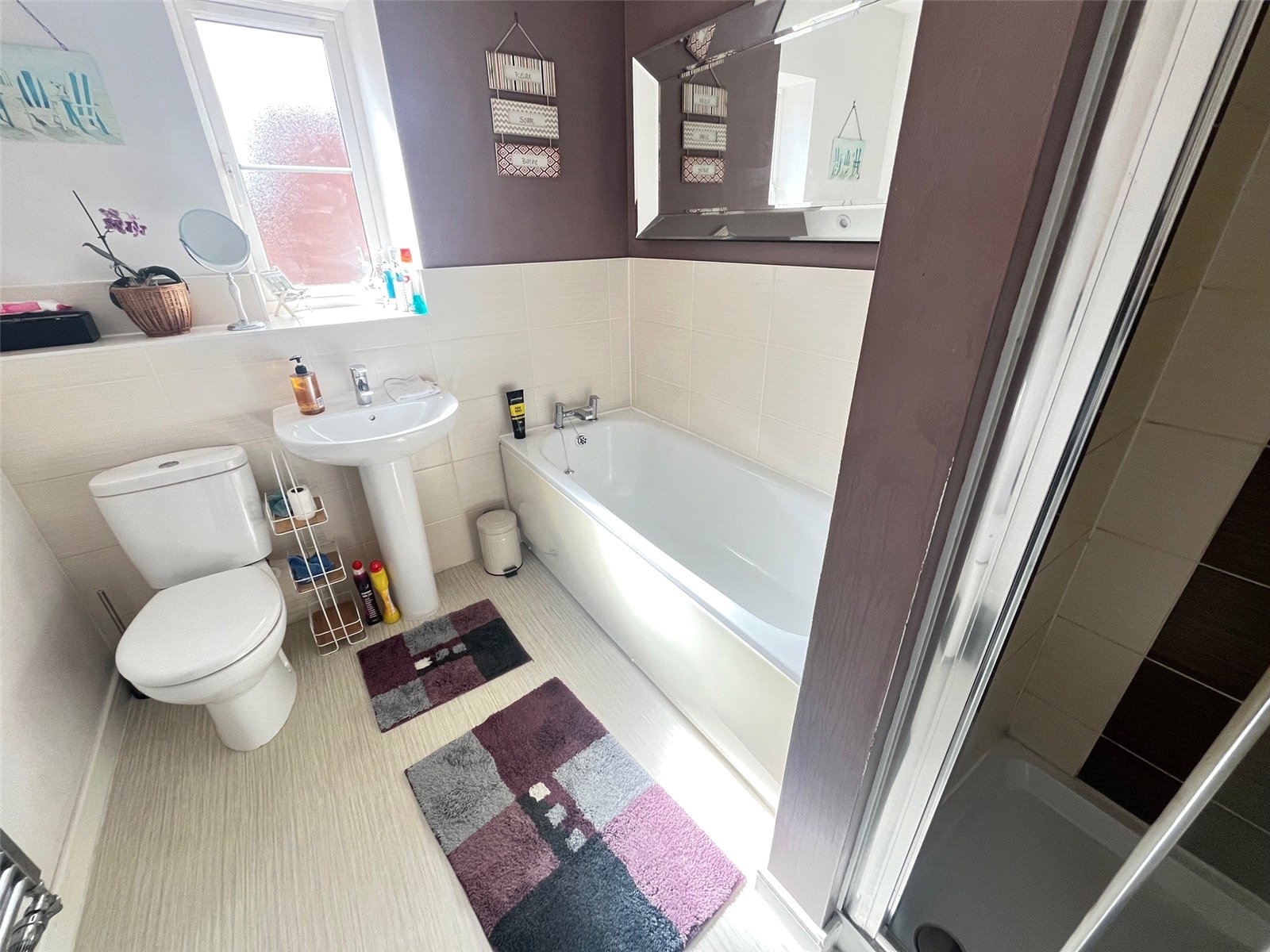 Bathroom 8'10" x 6'6" (2.7m x 1.98m). Fitted with a white four piece suite comprising of low level WC, pedestal wash hand basin with mixer tap over, panel bath with mixer tap over, shower cubicle with shower over, recessed lighting, tiling to water sensitive areas, opaque Upvc double glazed window to side aspect, chrome heated towel rail