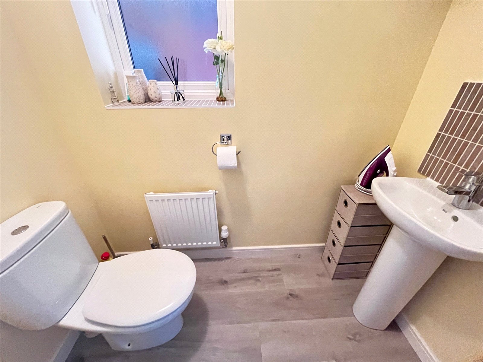 WC 5'6" x 2'8" (1.68m x 0.81m). Fitted with a white two piece suite comprising of low level WC, pedestal wash hand basin with mixer over and tiled splashback, radiator, continuation of wood laminate flooring from lounge, opaque Upvc double glazed window to side aspect with tiled sill