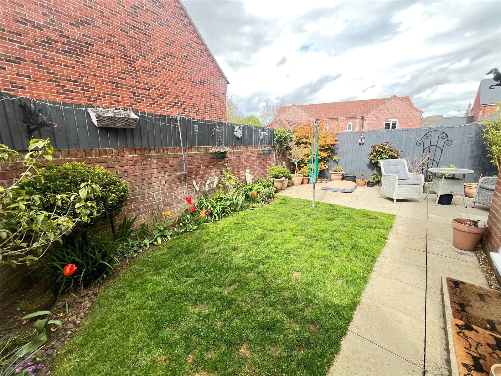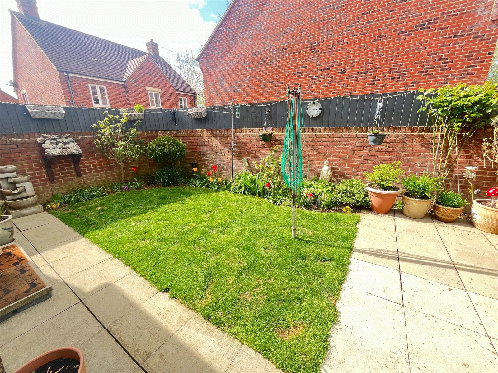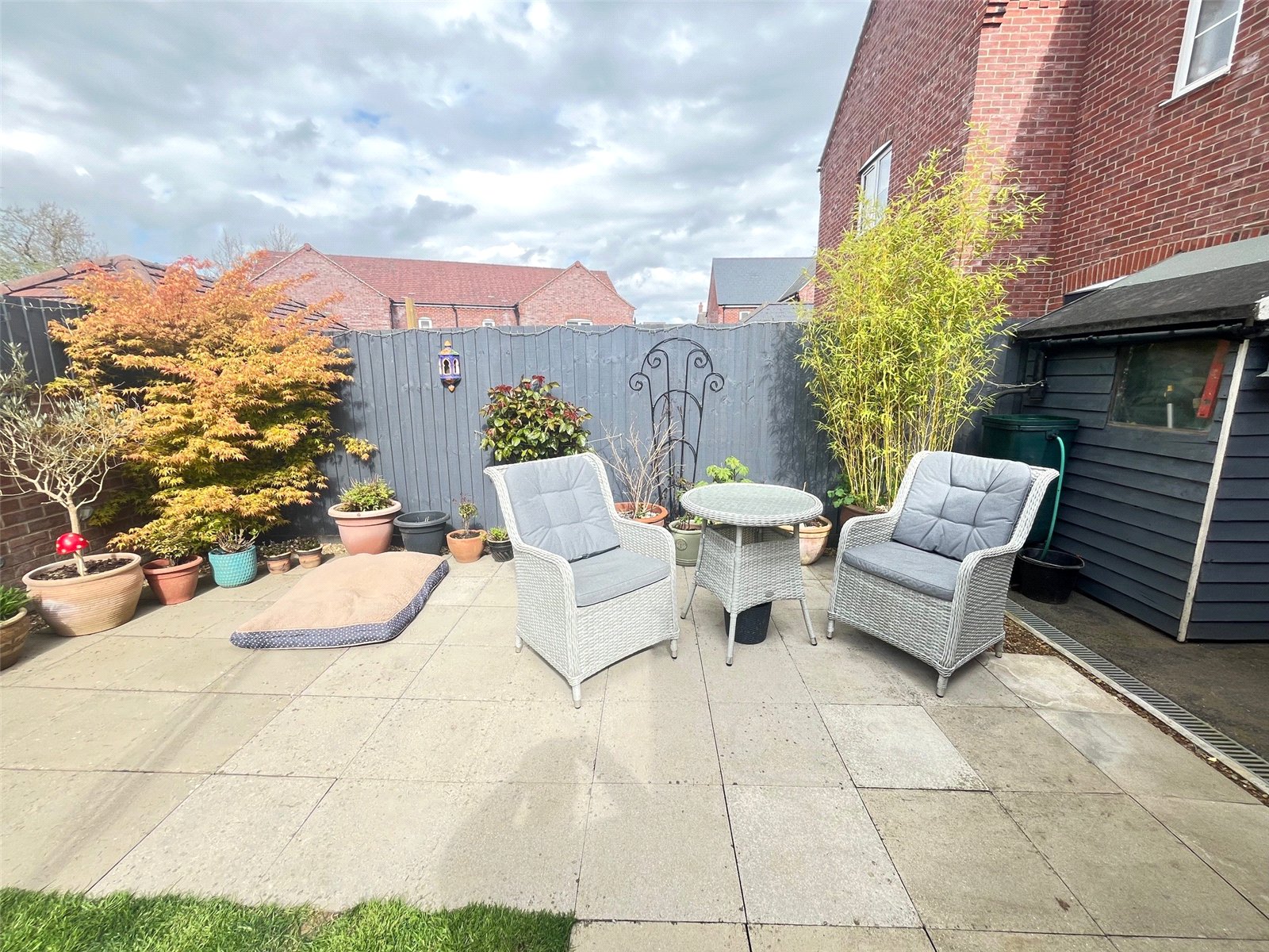 Rear    A private and enclosed rear garden with paved pathway with paved patio area, lawn area with shrubs and flower borders, side storage area, outside light, hardstanding for wooden shed, gated access to garage, external power and water