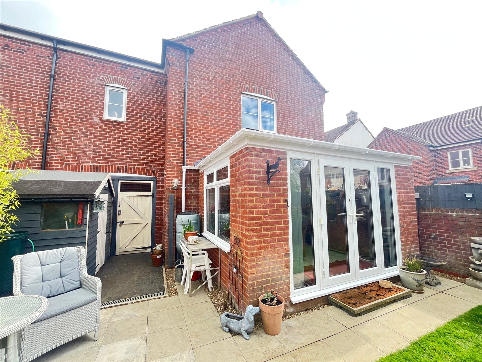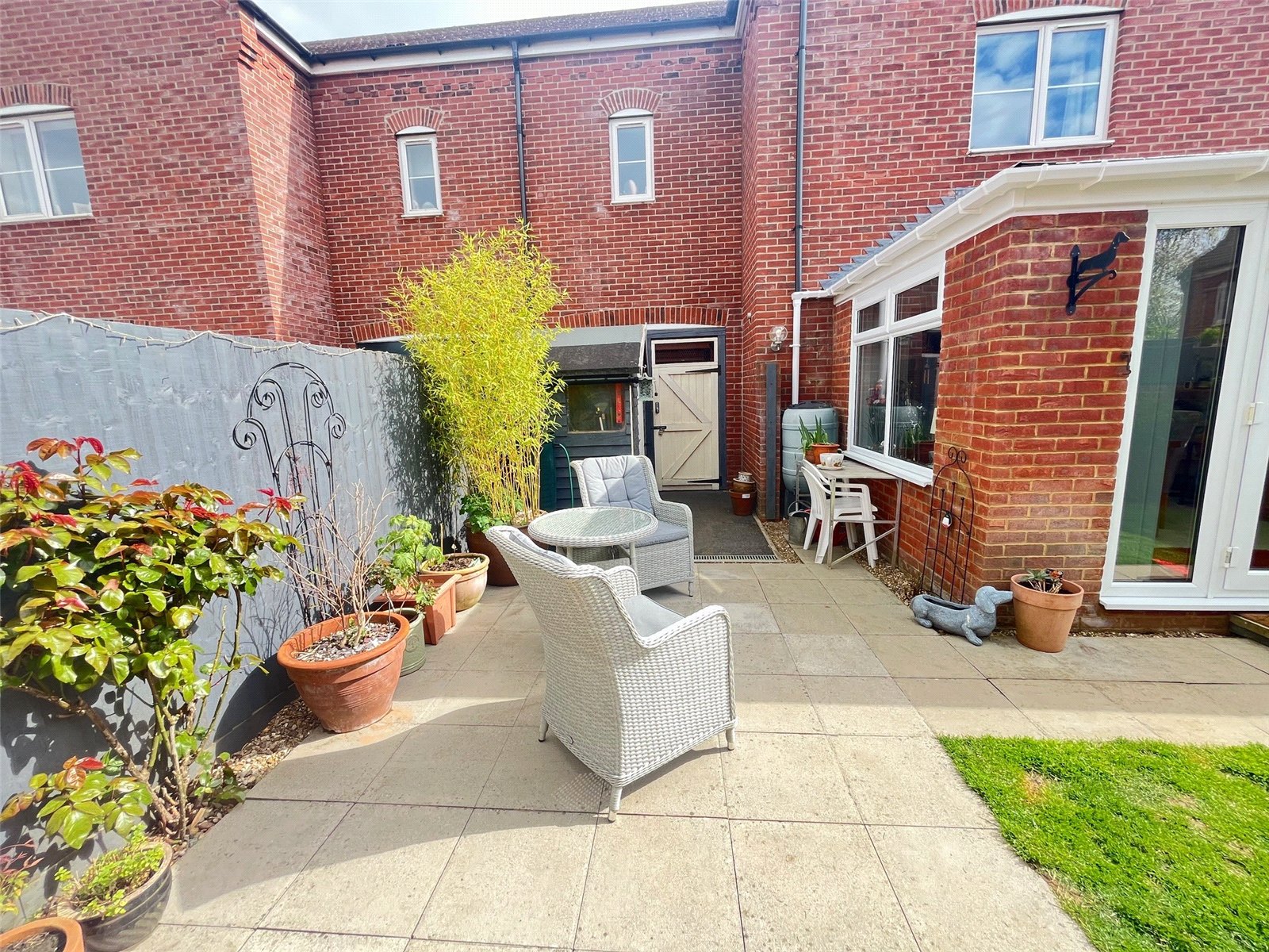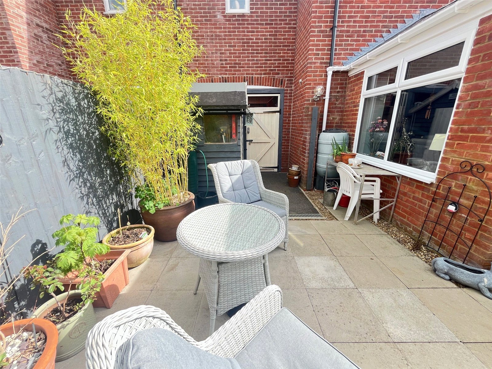 Rear    A private and enclosed rear garden with paved pathway with paved patio area, lawn area with shrubs and flower borders, side storage area, outside light, hardstanding for wooden shed, gated access to garage, external power and water