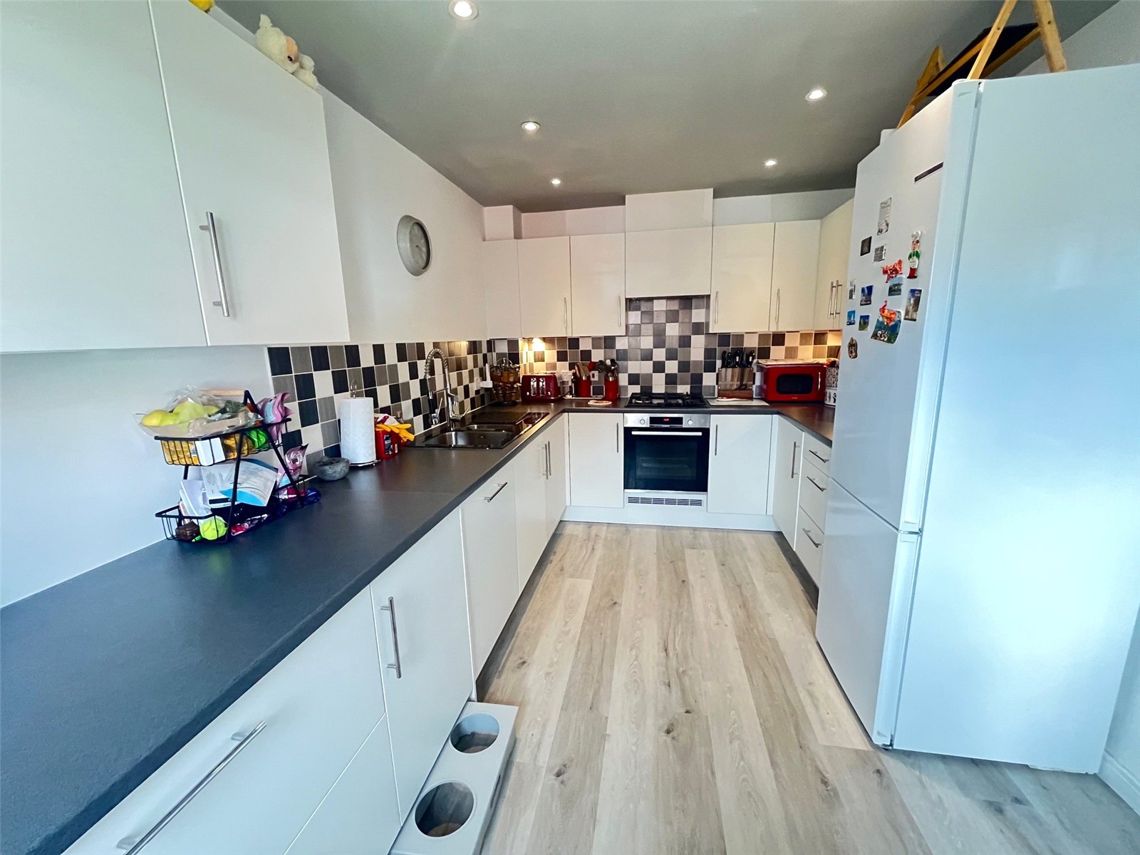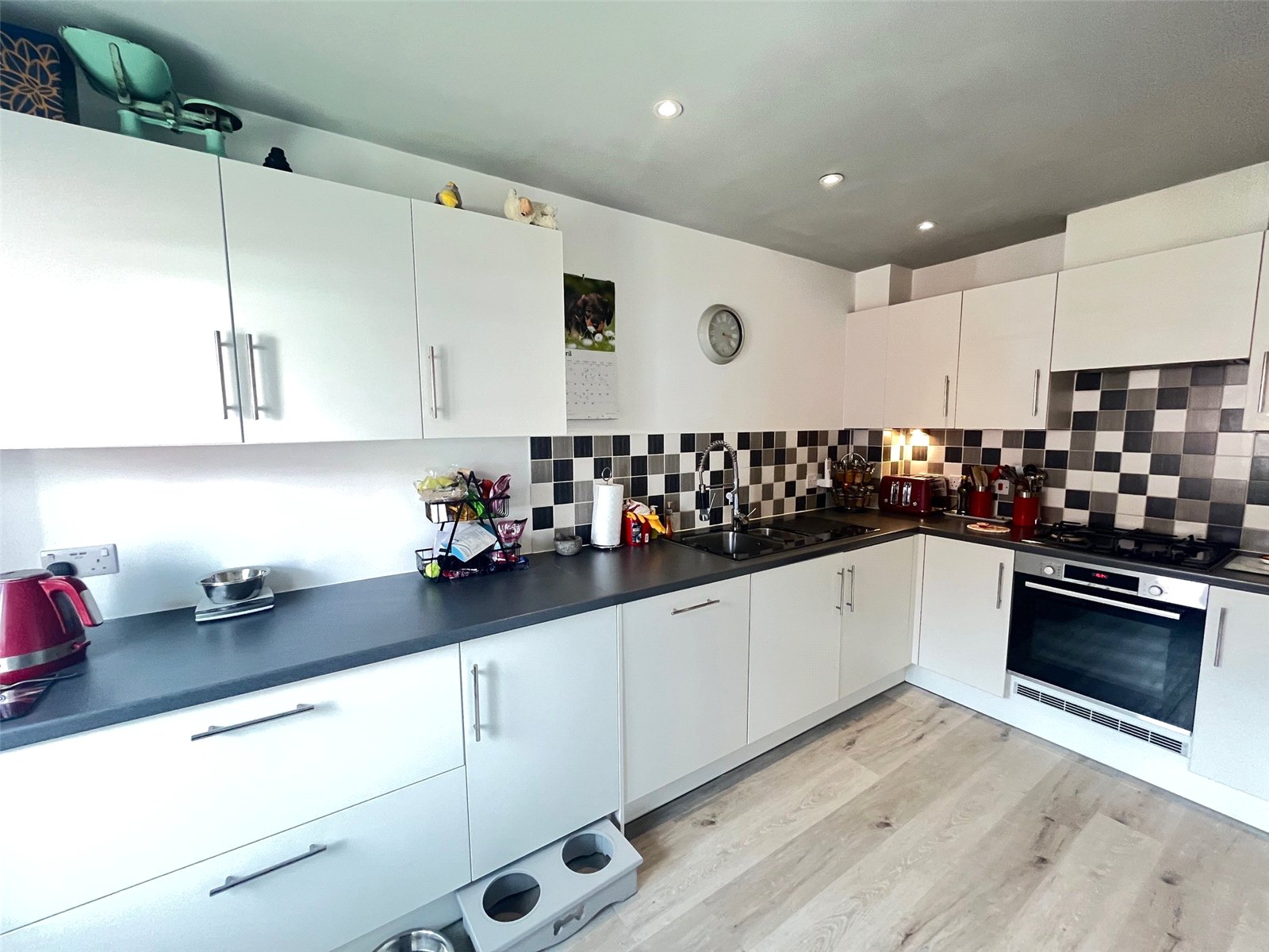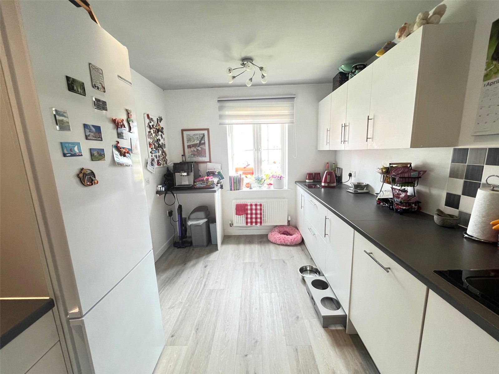Kitchen 14' x 8'6" (4.27m x 2.6m). Fitted with a range of eye and base level units with rolled edge work surfaces over, with the wall units having under unit lighting. Inset electric oven, gas hob and pull out extractor fan over, one and a quarter bowl stainless steel sink and drainer unit with mixer tap over, tiling to water sensitive areas, space for upright fridge/freezer, drawer stack, deep drawer units, built in washing machine, built in dishwasher, wood laminate flooring, radiator, Upvc double glazed window to front aspect, recessed lighting