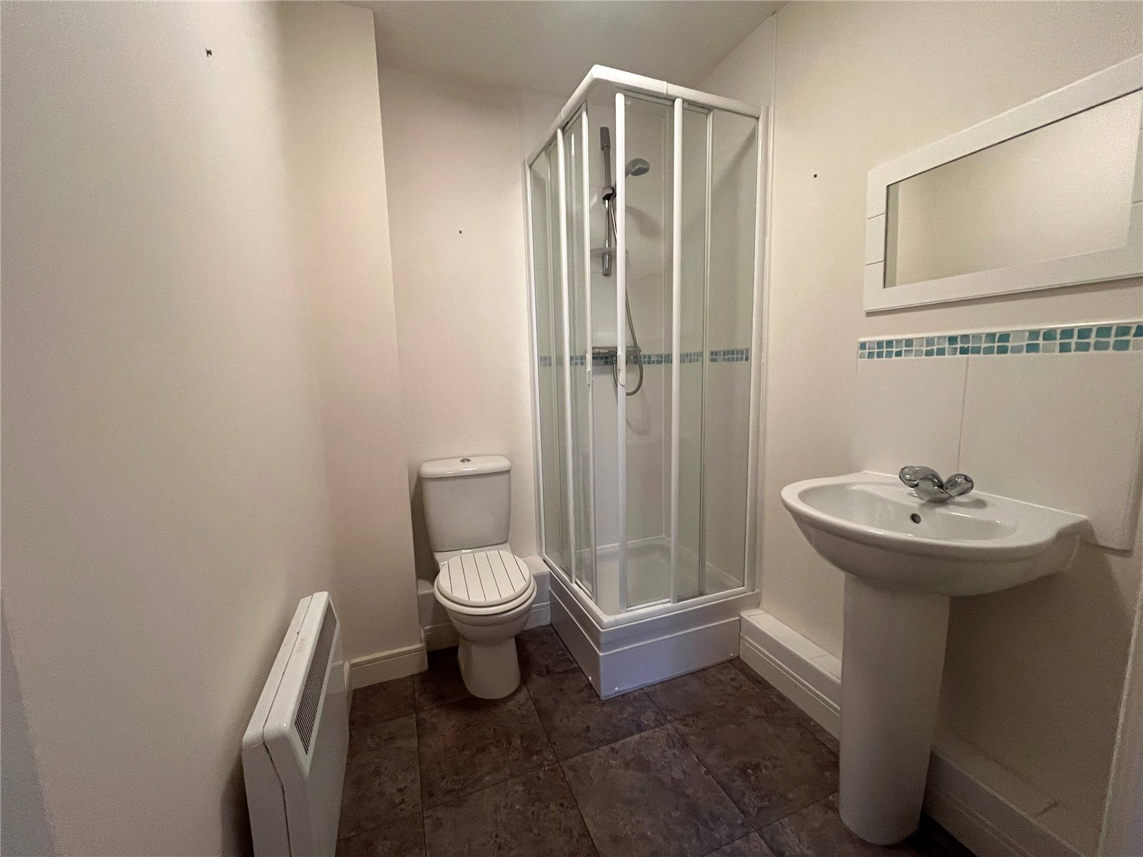 En-Suite 6'4" x 5'4" (1.93m x 1.63m). A white three piece suite comprising of low level WC, pedestal wash hand basin with chrome mixer tap, shower cubicle with plumbed in shower, tiling to water sensitive areas, electric storage heater, electric shaver point, extractor.
