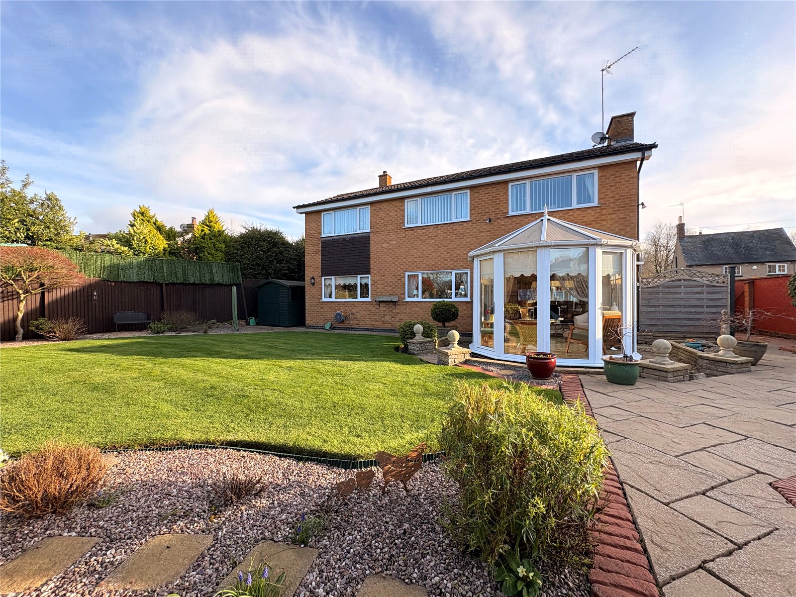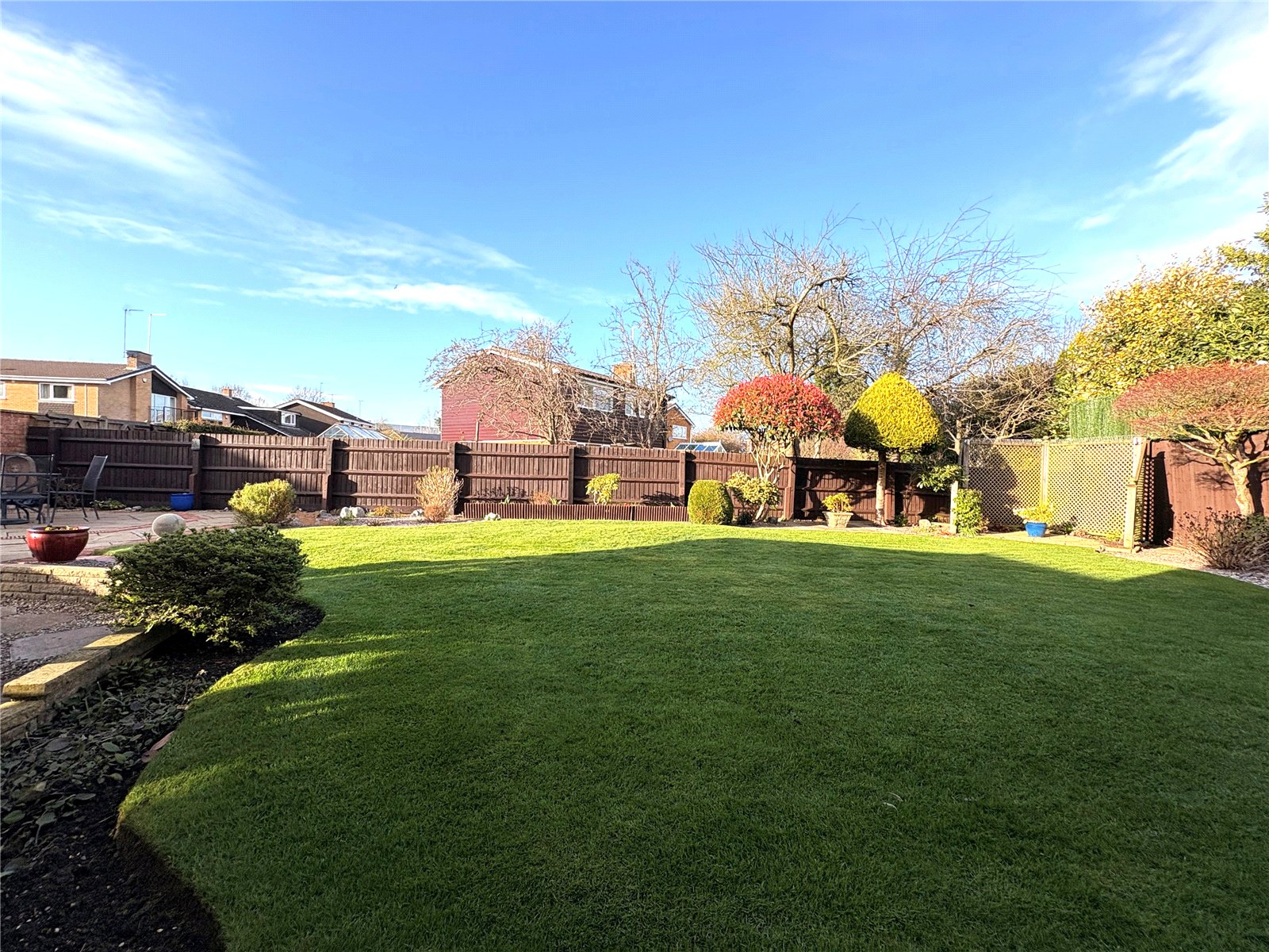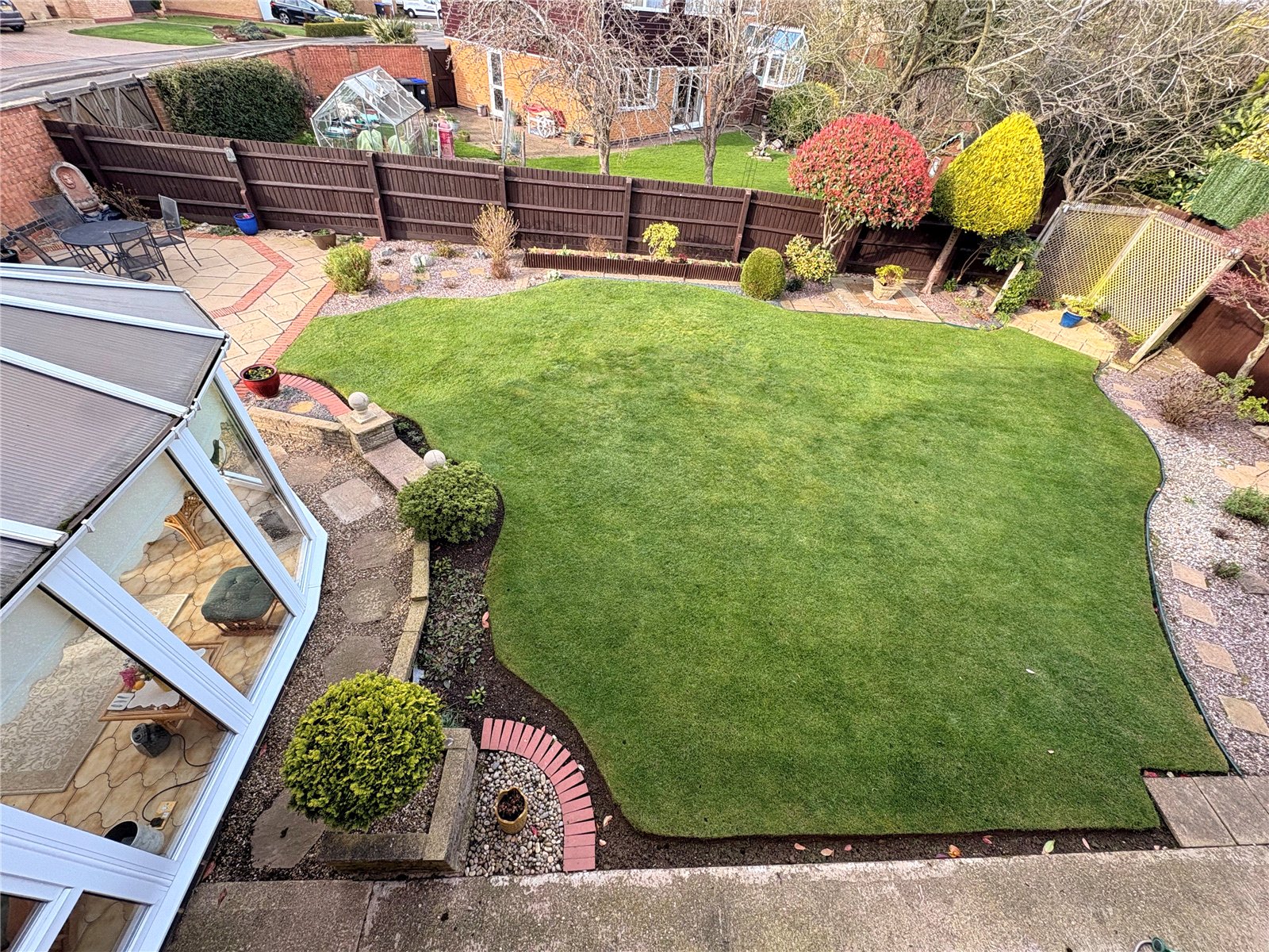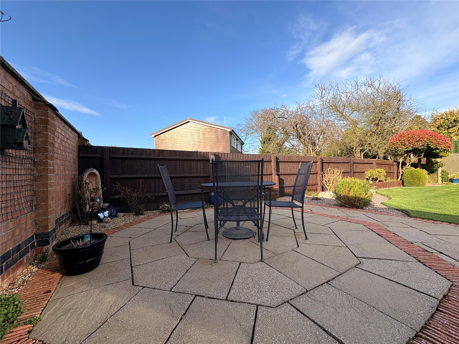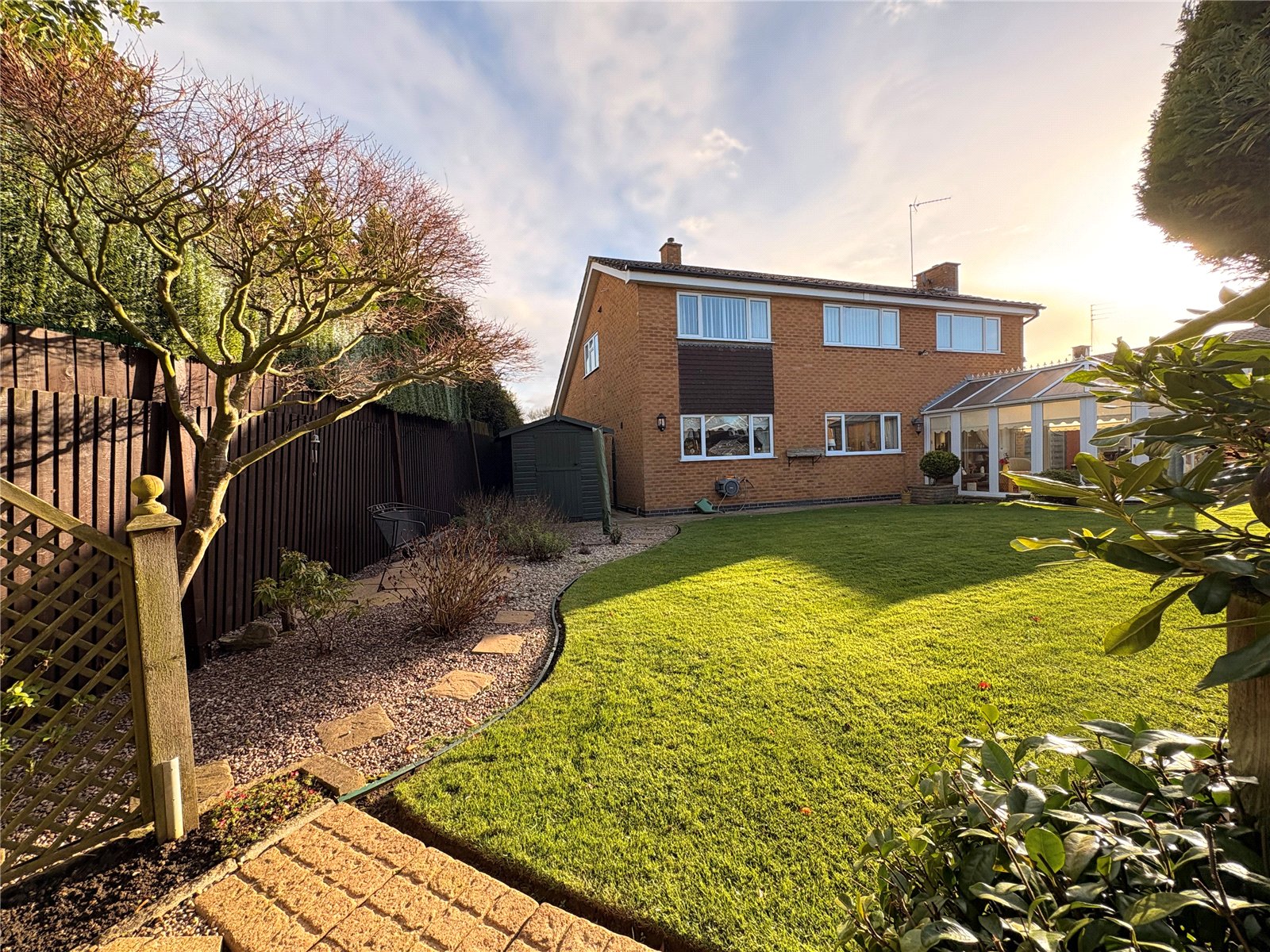 Rear A beautifully maintained and generously sized rear garden with a central shaped lawn area. To one corner of the garden is a spacious paved patio area providing a pleasant area for outdoor seating. The garden has a mature feel to it with a variety of planted shrubs and shaped bushes and with a good sized paved area to one side of the house with ample space for a garden shed. The garden has an outside tap and lighting and is enclosed by combination of fencing and brick walling.
