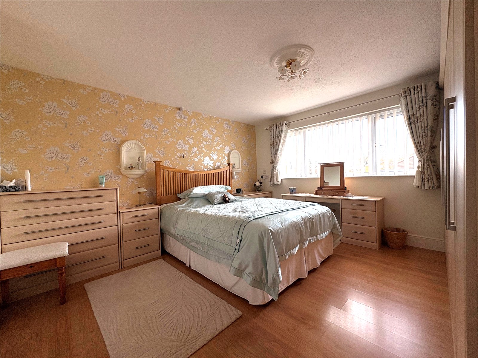 Bedroom One 12'11" x 12' (3.94m x 3.66m). A lovely and generously sized main bedroom fitted with a comprehensive range of furniture to include dressing table, three sets of drawers and three double and one single wardrobe along one wall. Wood effect laminate flooring, decorative ceiling rose, single panel radiator, Upvc double glazed window to rear aspect, white panel door to :-