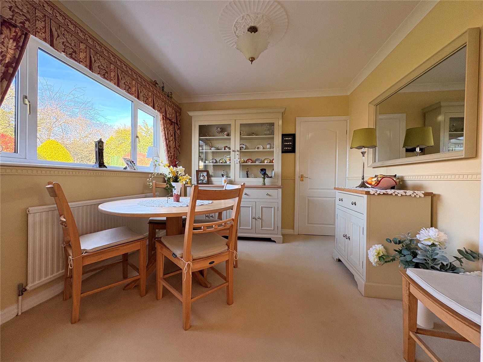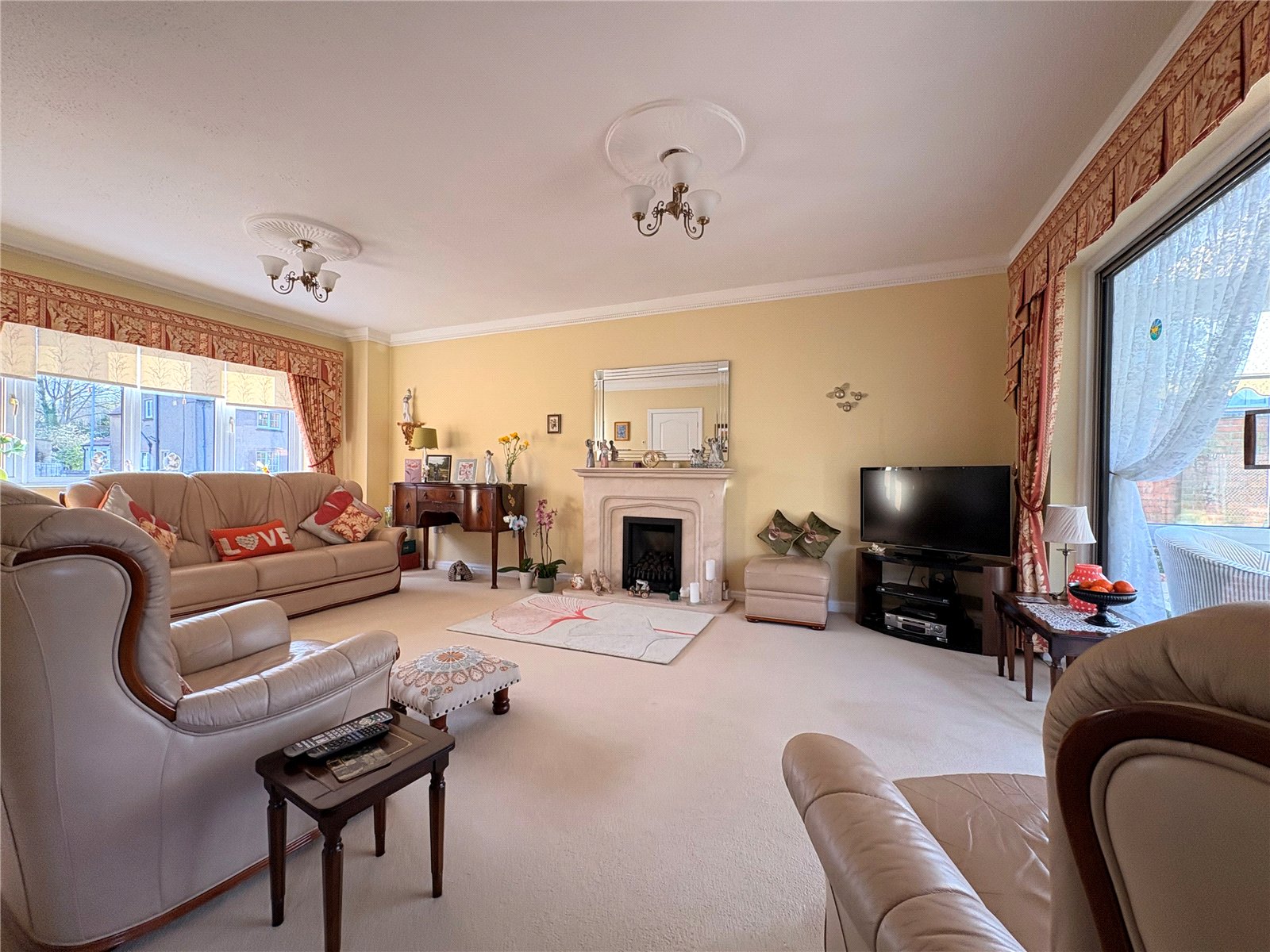 Lounge 18'11" x 12' (5.77m x 3.66m). A beautifully presented primary reception room with the main focal point being a central fireplace with marble hearth and surround with inset 'Adams' style real flame gas fire. Decorate coving to ceiling, two decorative ceiling roses, television point, sliding patio doors to conservatory, opening into dining room, Upvc double glazed bow window to front aspect with deep sill and double panel radiator under, further double panel radiator