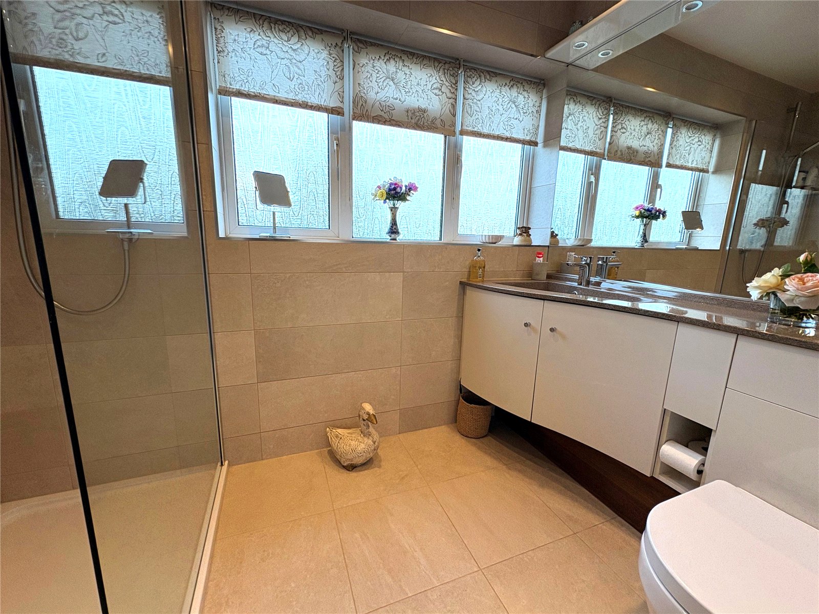 Shower Room 8' x 6'7" (2.44m x 2m). A beautifully refitted shower room which has a double width low profile walk in shower with glass screen, start/stop shower control and fitted with an Aqualisa chrome shower. To the opposite wall is a vanity unit with inset shaped sink with mixer tap over and close couple WC, with storage cupboards and inset toilet roll holder, full tiling to walls, tiled flooring, heated towel rail, mirror with overhead lighting, further inset spotlights, extractor fan, frosted Upvc double glazed window to side aspect with tiled sill