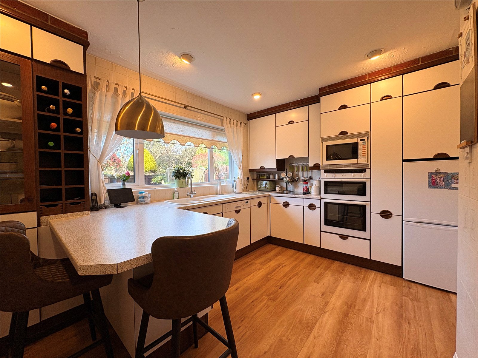 Kitchen 12'6" x 9'6" (3.8m x 2.9m). Fitted with a comprehensive range of both eye and base level units with rolled edge work surfaces over and tiling above. The units include a glazed display cabinet and open wine rack with integrated 'Neff' dishwasher, 'Neff' double electric oven plus electric hob with concealed extractor fan over plus further space for fridge/freezer. The work surfaces extend out to create a breakfast bar with space under for two stools. Inset one and a half bowl polycarbonate single drainer sink unit with chrome swan neck mixer tap over, double panel radiator, inset spotlights, wood effect flooring, Upvc double glazed window to rear aspect with tiled sill, white panel door to: -
