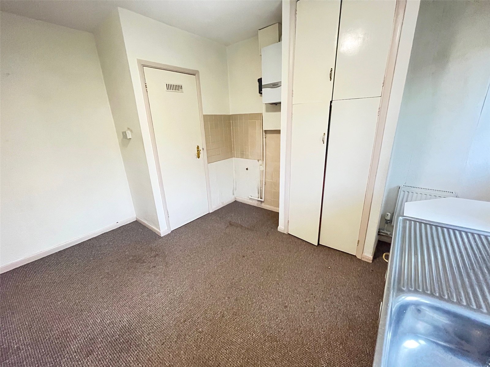 Kitchen/Diner 11'10" Max x 10' (3.6m Max x 3.05m). Stainless steel single drainer sink unit with mixer tap over set into base level units, space for cooker, space and plumbing for washing machine, airing cupboard housing hot water tank and slatted linen shelving, radiator, wall mounted central heating boiler, larder cupboard with shelving, tiling to water sensitive areas, Upvc double glazed window to rear aspect with views over rear garden, part opaque Upvc double glazed door opening onto garden