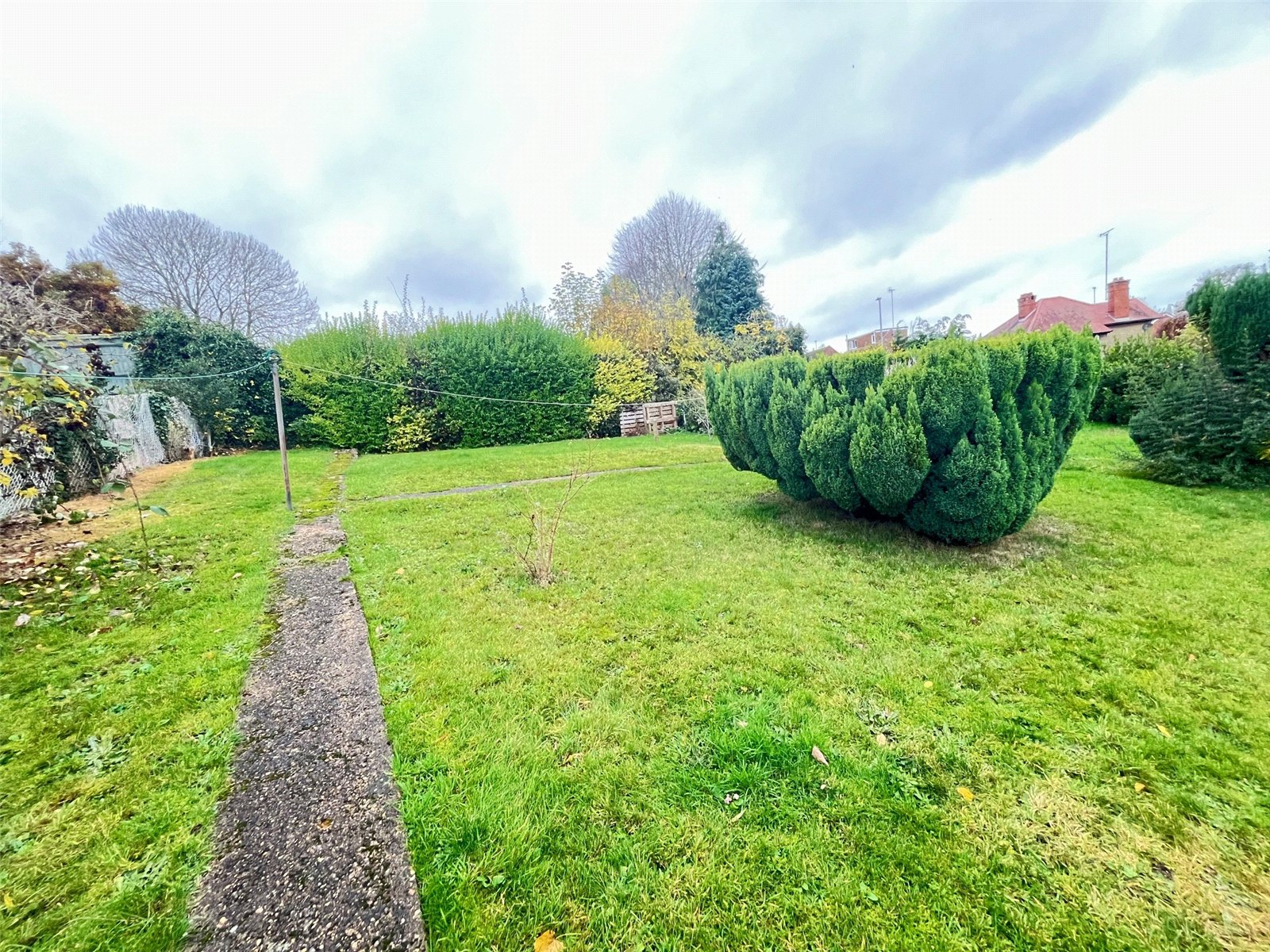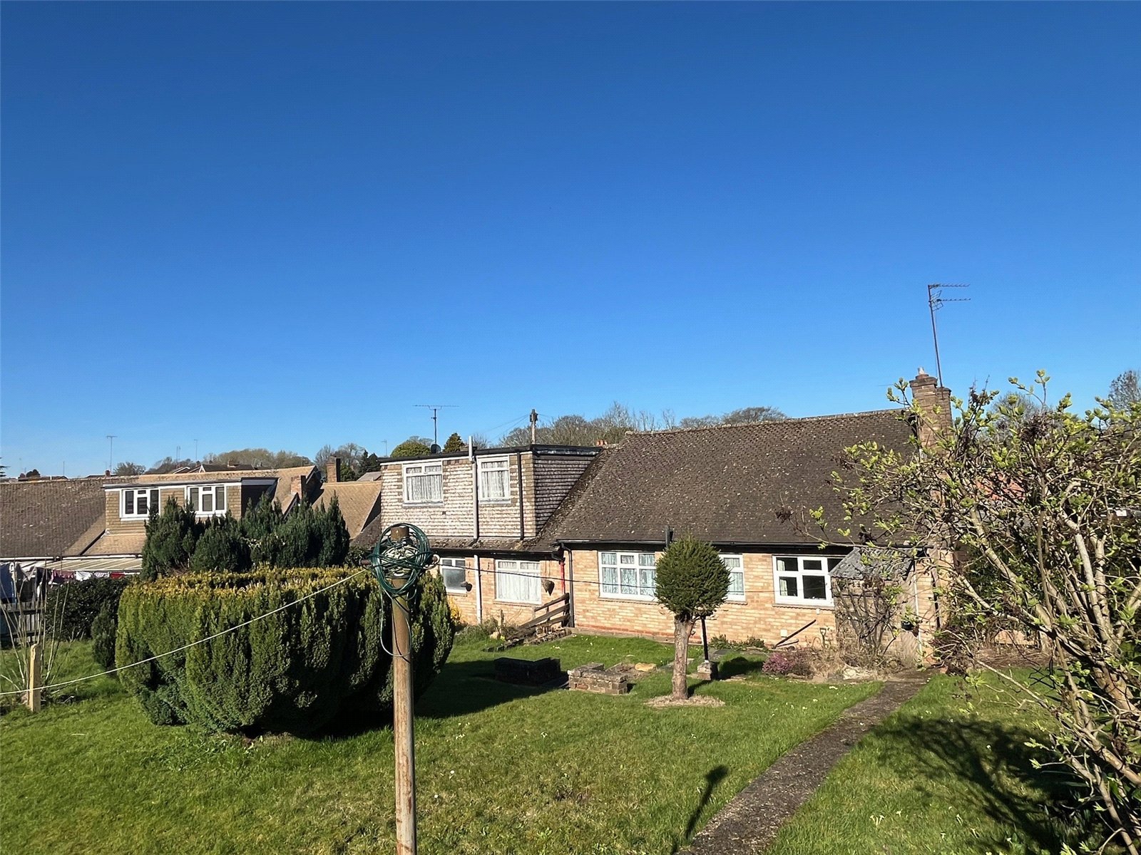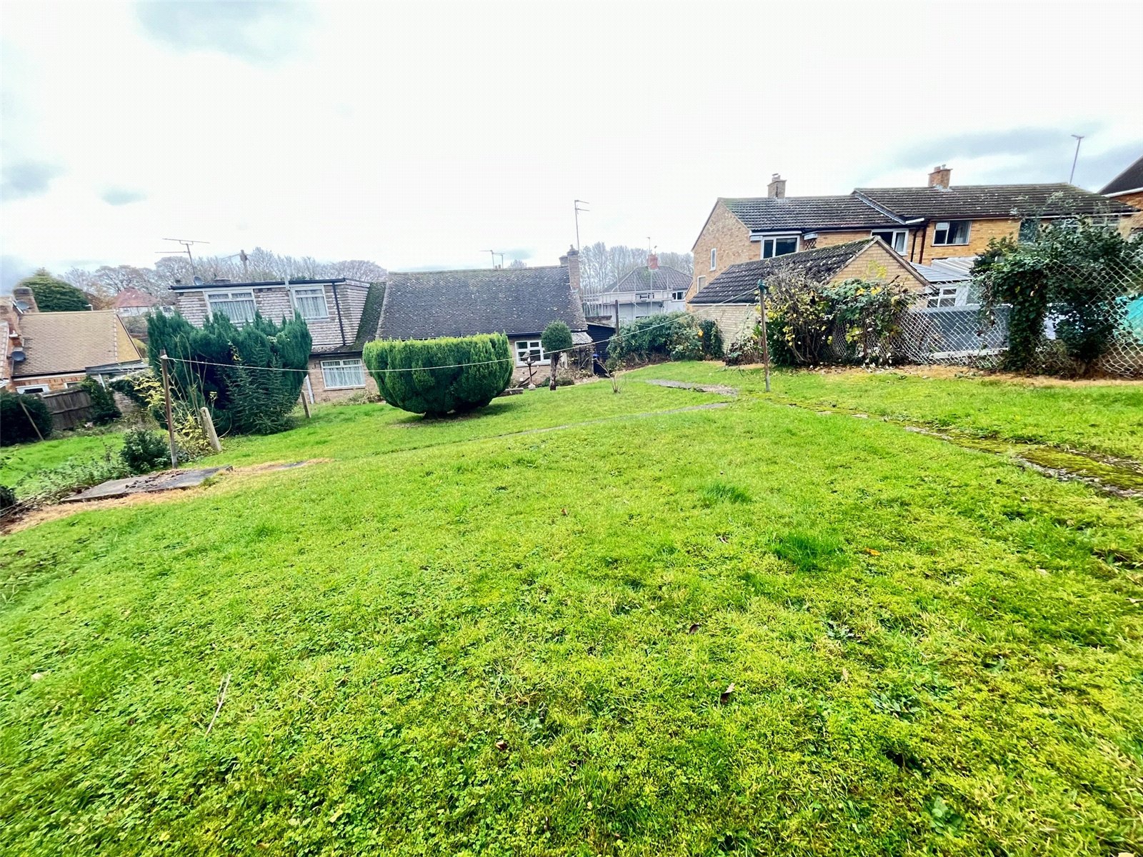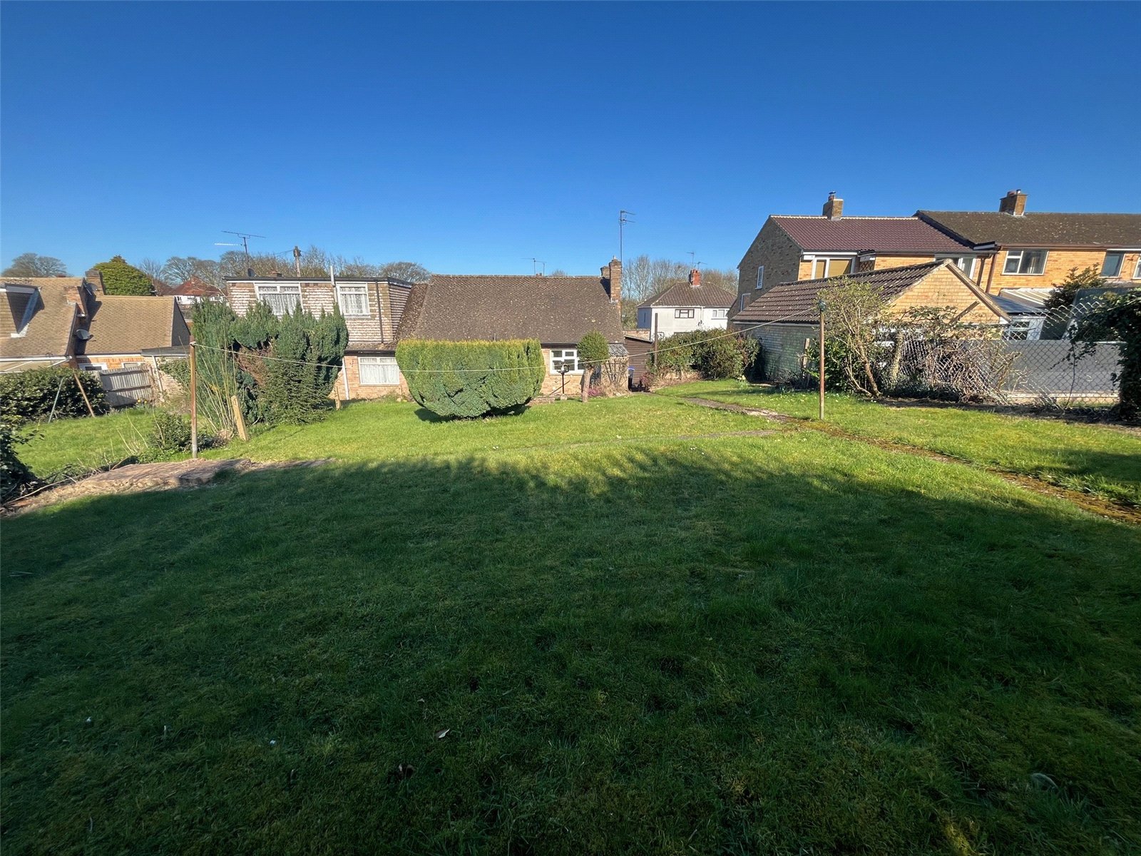 Rear    Brick built outbuilding, tiered lawn area with steps up to further large lawn area with shrubs, flowers and mature bush borders. A pathway runs the length of the garden, side access with access to front, enclosed by mature shrubs and link fencing