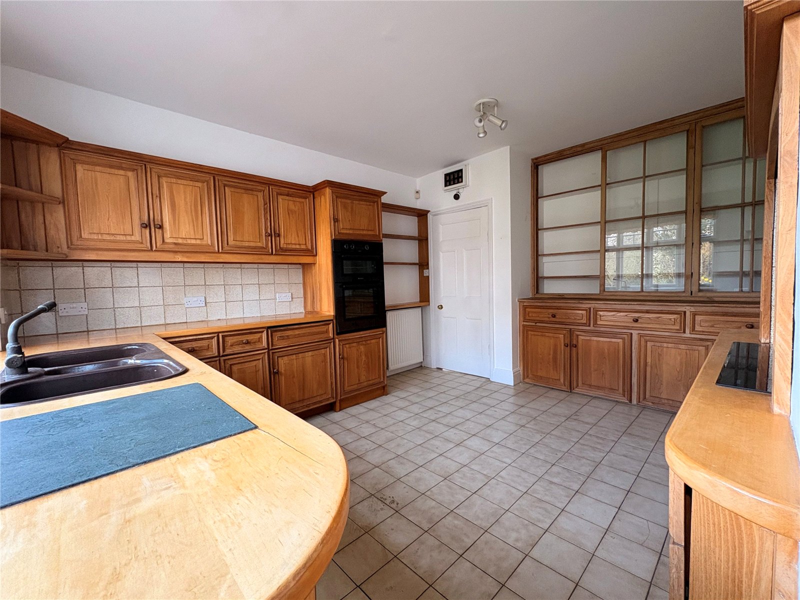 Kitchen 15'2" x 11'11" (4.62m x 3.63m). Fitted with a range of oak fronted eye and drawer line base level units with solid wooden work surfaces over and tiling above. Inset one and a half bowl single drainer sink unit with mixer tap over, integrated dishwasher and fridge, integrated eye level electric oven with integrated electric hob and extractor fan over to opposite wall. To the back wall are further drawer line base level units with feature glass fronted display shelving over, tiled flooring, window to rear aspect, white panel door to utility and :-