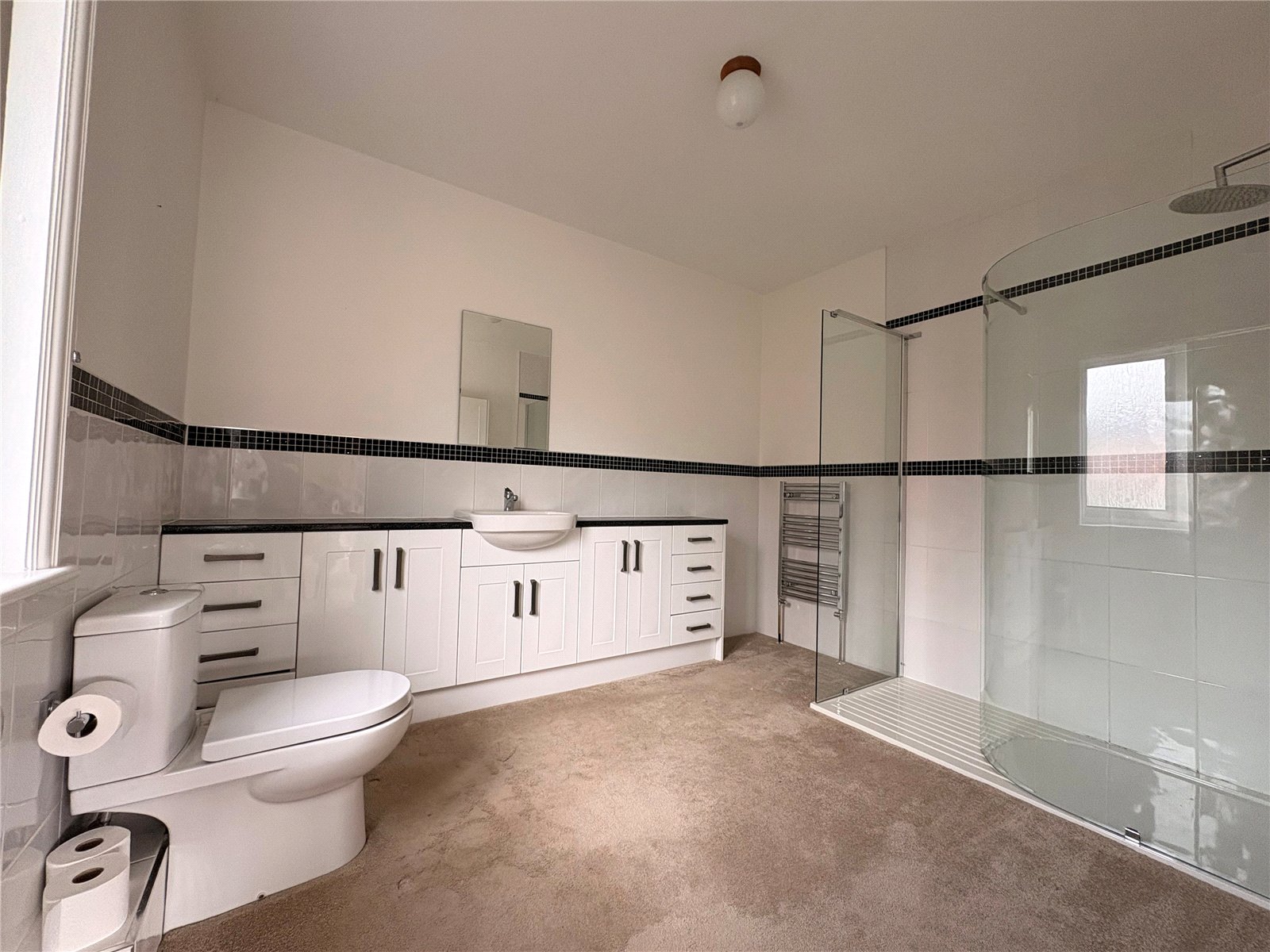 Ensuite Bathroom 10'10" x 9'1" (3.3m x 2.77m). A large ensuite which has been refitted with a three piece suite comprising of low level push flush WC, walk in double shower cubicle with glass enclosure and tiling to two walls and with a chrome shower with both fixed and handheld shower heads. A large vanity unit with cupboards and drawers sits to one wall with central wash hand basin with central chrome mixer tap over and tiling above, half height tiling to remaining walls, single panel radiator, frosted window to side aspect