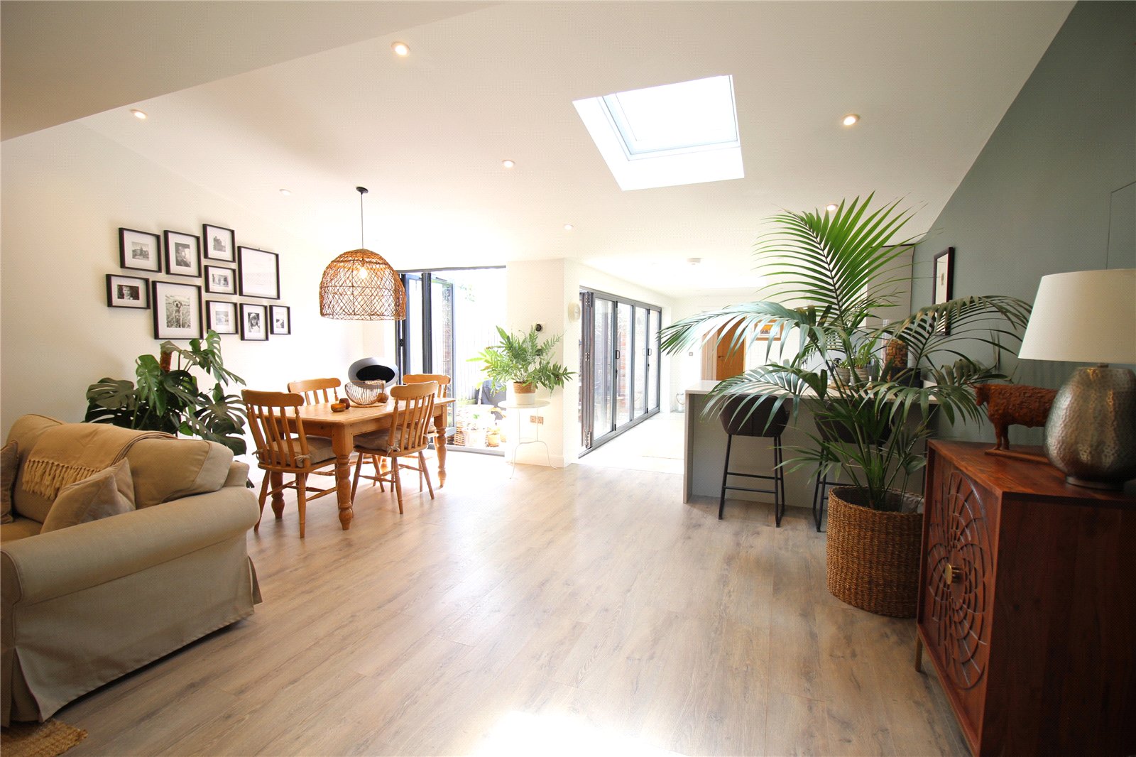 Dining Area 17'8" (5.38m) reducing to 16'6" (5.03m) x 12'5" (3.78m). A lovely bright area with a sloped ceiling and Velux double glazed skylight giving added character, double glazed bi-fold doors open out onto the courtyard, inset LED downlighters, wood flooring with under floor heating running through the whole of the 27'7 lounge and dining area. Step down into the kitchen.