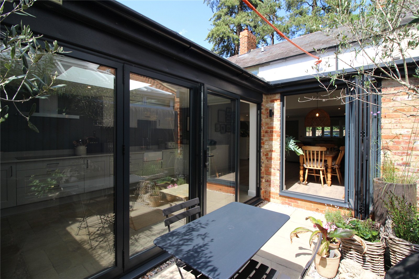 Rear A low maintenance courtyard garden which is mainly paved and is accessed from both living area and kitchen via bi-fold doors, partial close board timber fence, outside lights. The air source heat pump is located in a small area to the rear of the property.