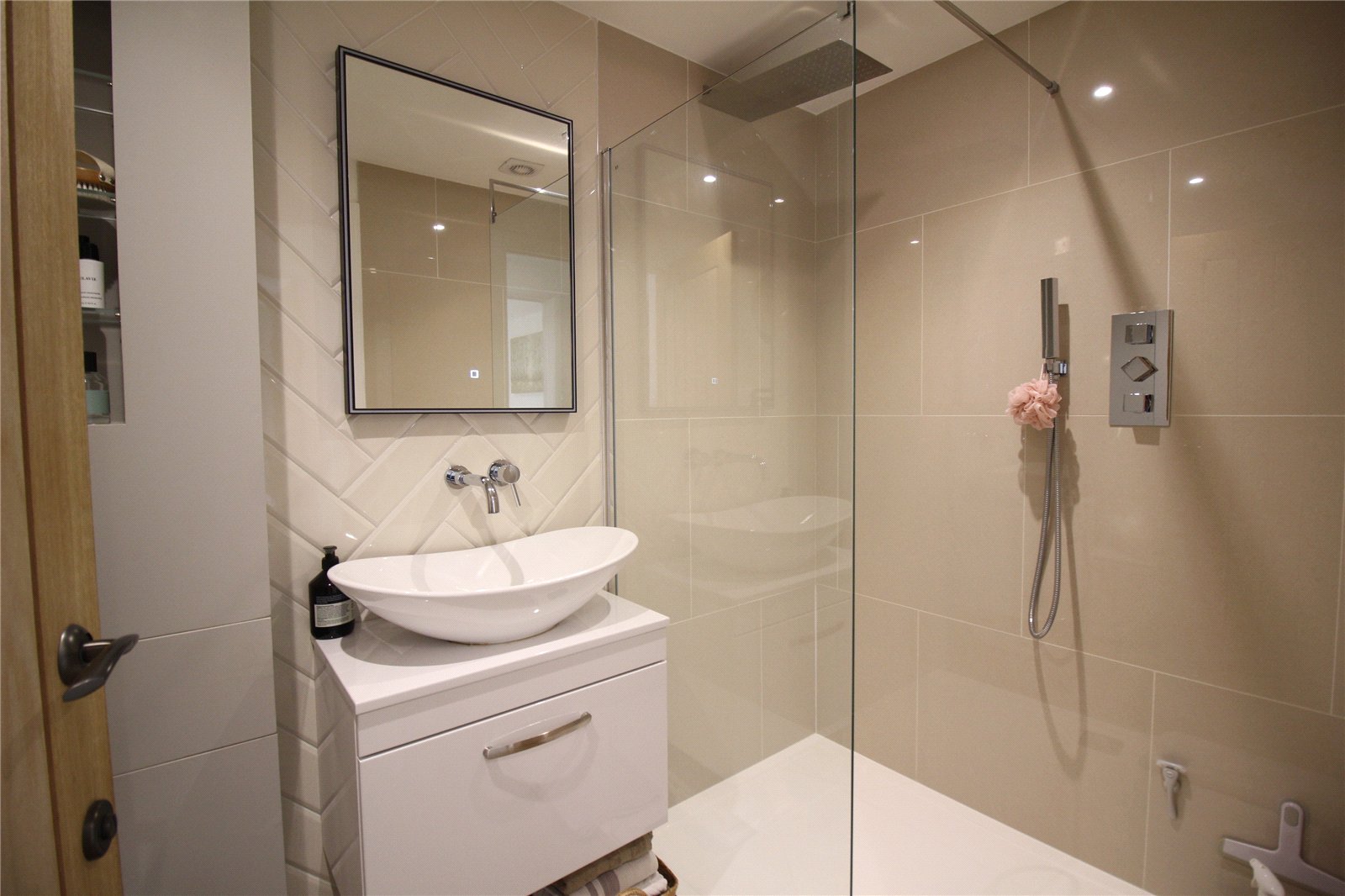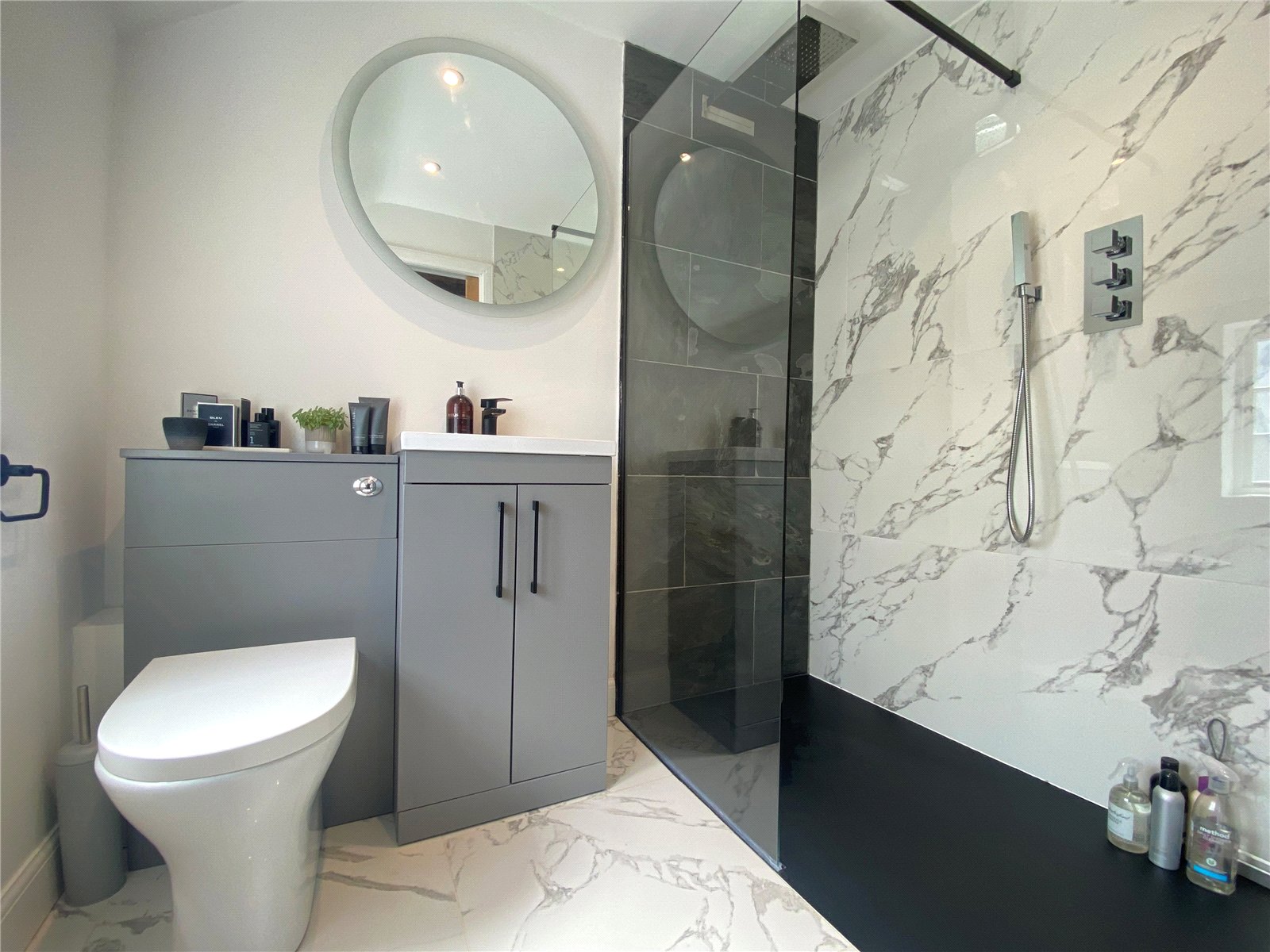 Ensuite Bathroom 7'2" x 5'1" (2.18m x 1.55m). A beautifully presented ensuite fitted with a three piece suite comprising full width shower cubicle with both fixed and flexi head shower, inset wash hand basin with vanity unit and concealed cistern WC, feature tiling, inset down lighters, extractor fan, heated towel rail, hard wood double glazed window to rear aspect.
