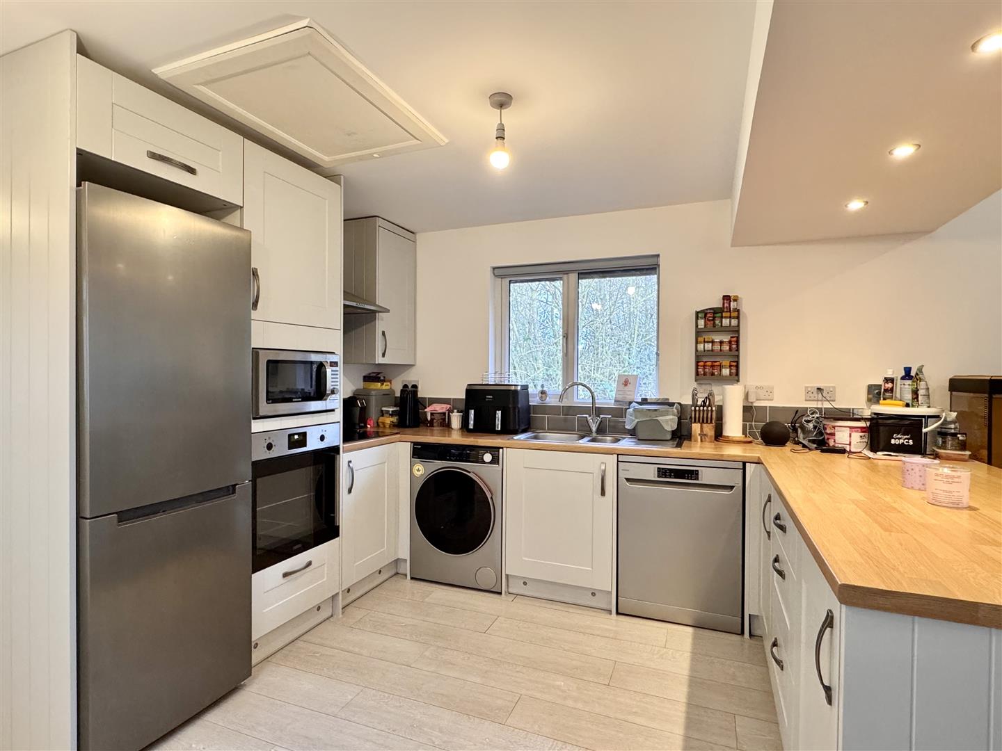 Kitchen / Dining / Family Room: - 7.47m x 4.27m (24'6 x 14'0) - Double glazed window to front aspect and Velux windows to front and rear aspects, a series of matching base and wall units, edged work surfaces incorporating a single bowl sink with central mixer tap, water softener, built-in double oven, induction hob with extractor hood over, integrated fridge/freezer, dishwasher, microwave oven and washing machine, breakfast bar with seating area, radiator, tiled flooring and high vaulted ceiling. Access door to courtyard area and bi-folding doors across rear aspect.