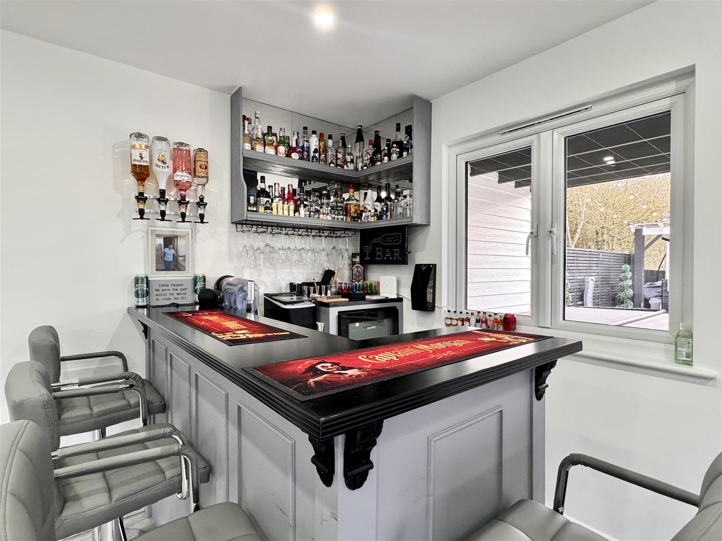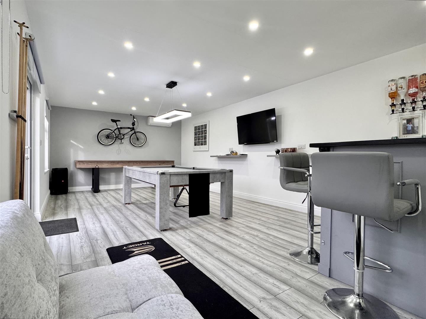Games Room / Studio: - 7.70m x 3.81m (25'3 x 12'6) - Detached outbuilding ideal for multi-purpose use, double glazed windows to front and side aspects, wall-mounted air conditioning unit, power and lighting.