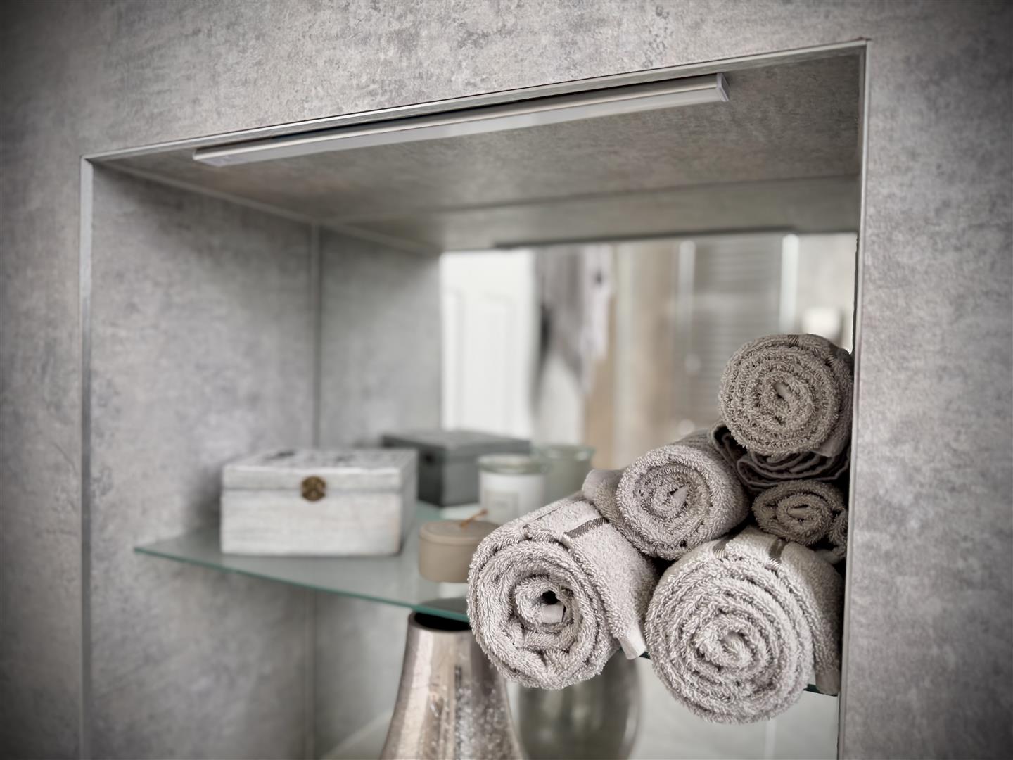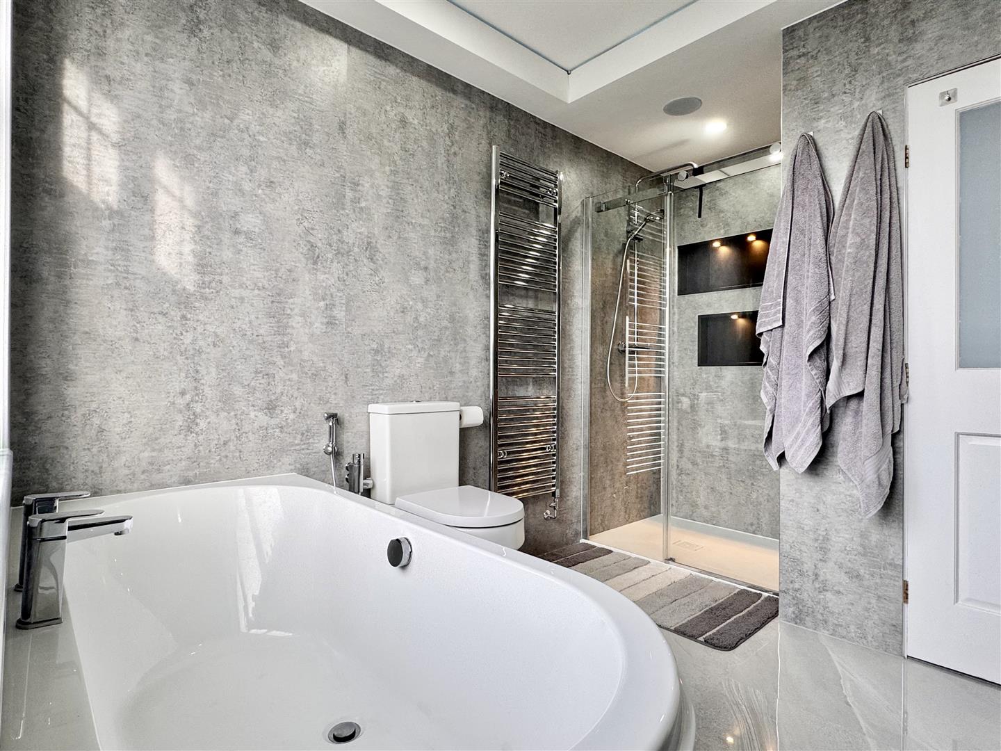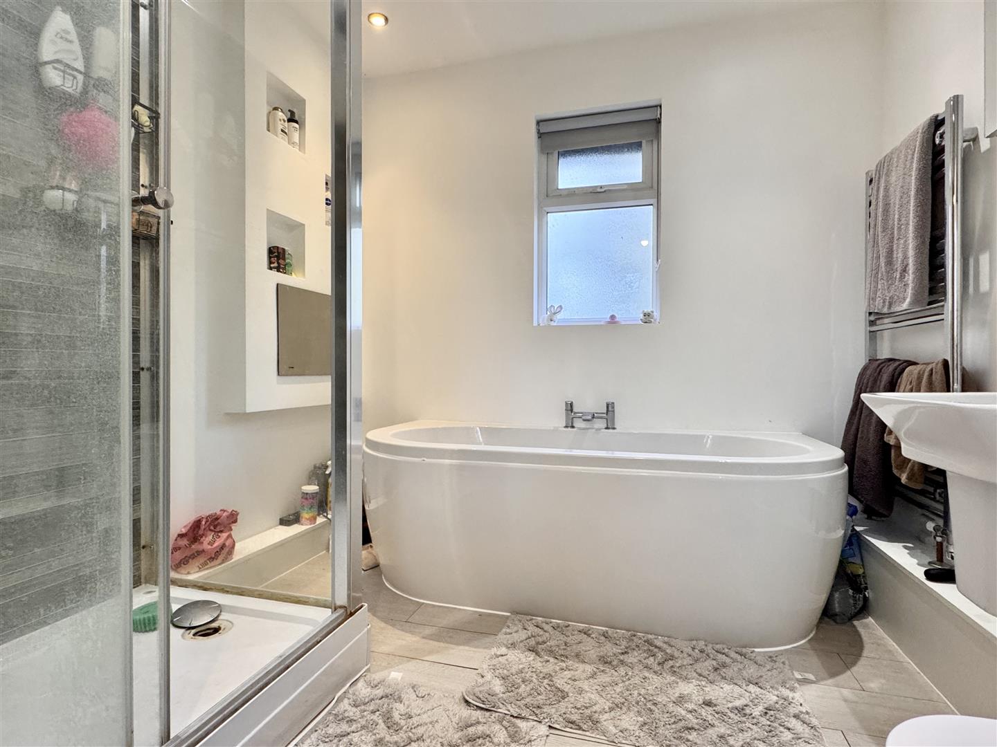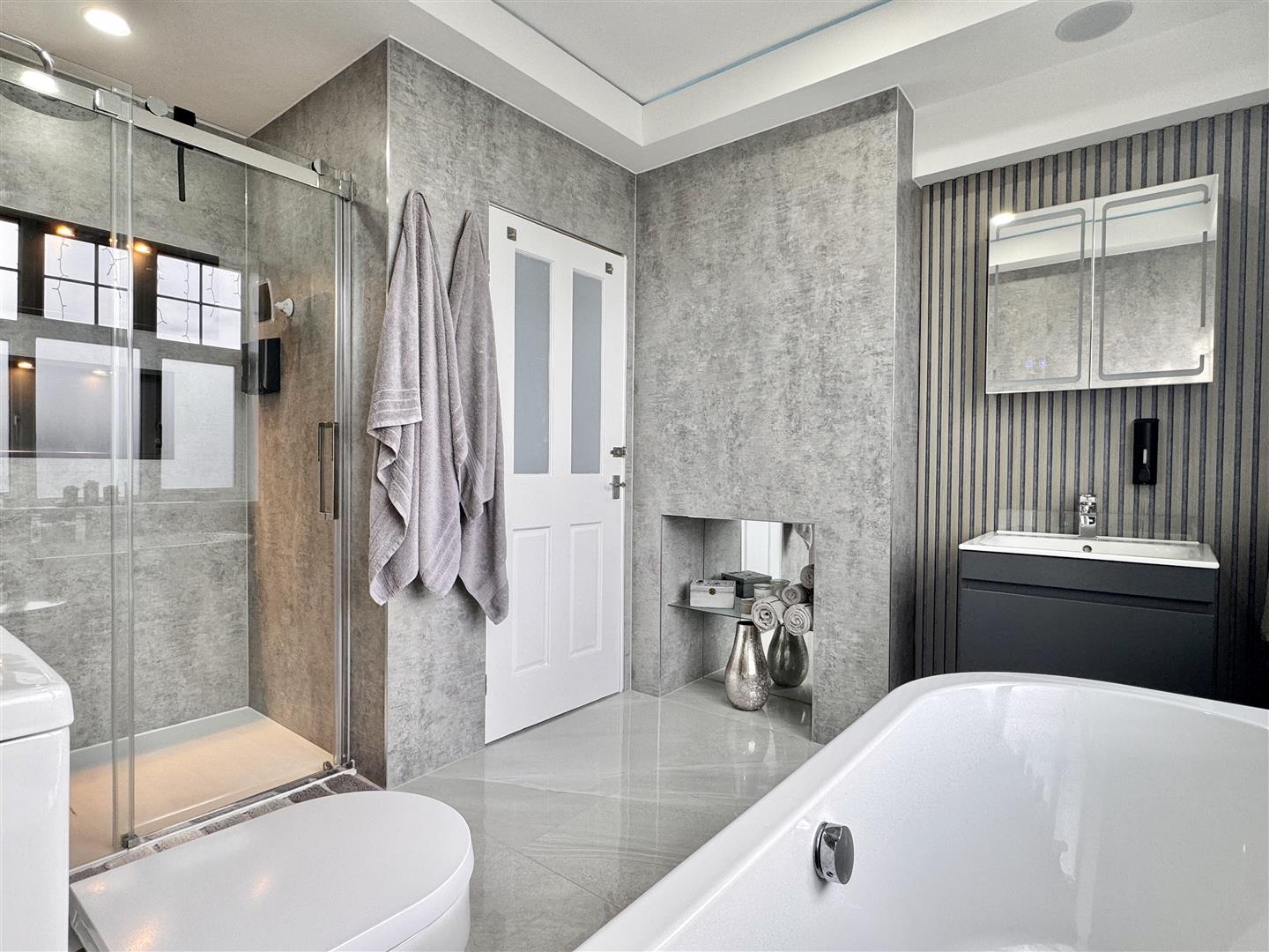 Family Bathroom: - Opaque double glazed window to side aspect, enclosed and fully tiled double shower, panelled bath with central mixer tap, low level WC, vanity wash hand basin, extractor fan, heated towel rail, tiled flooring.