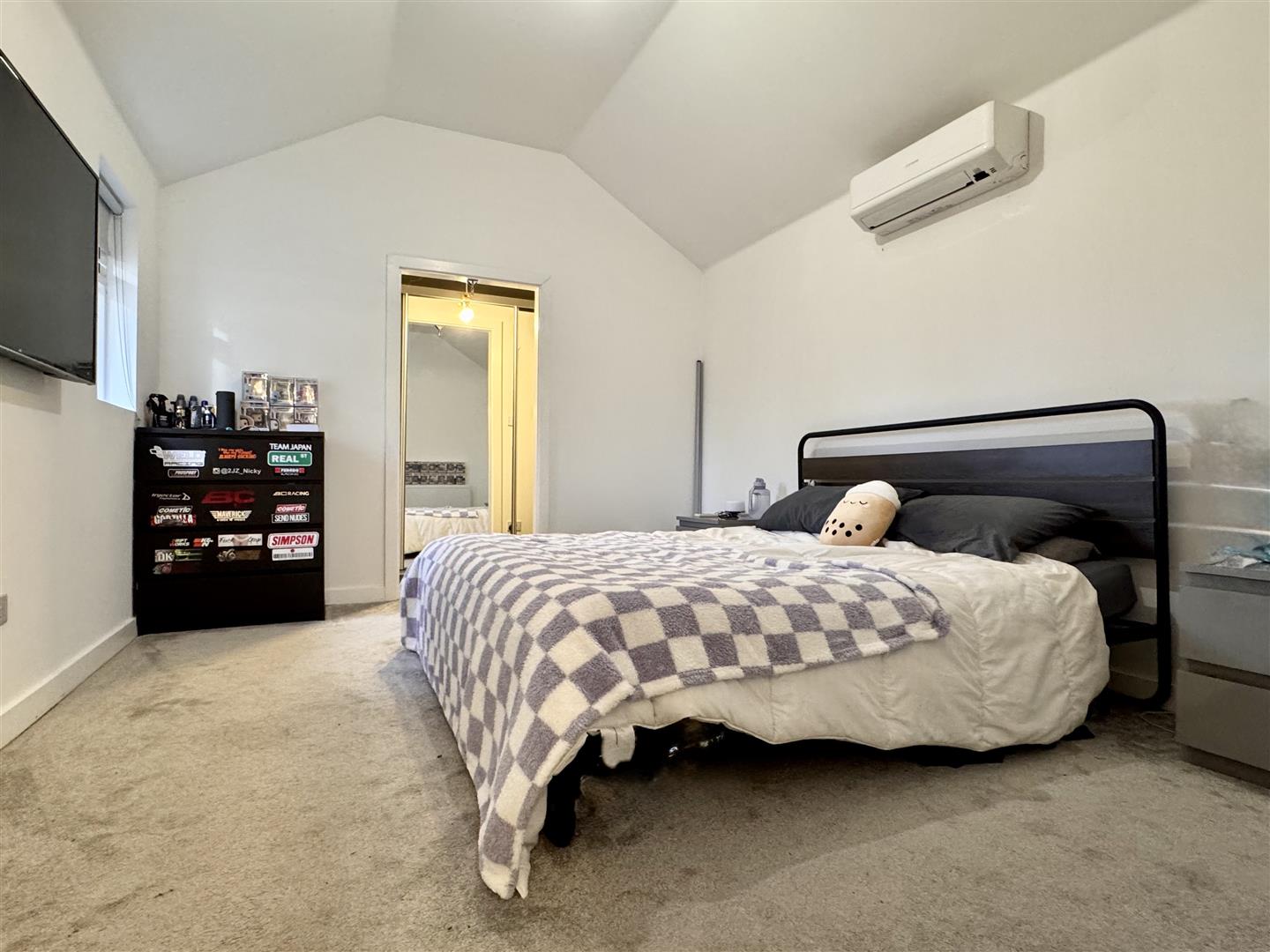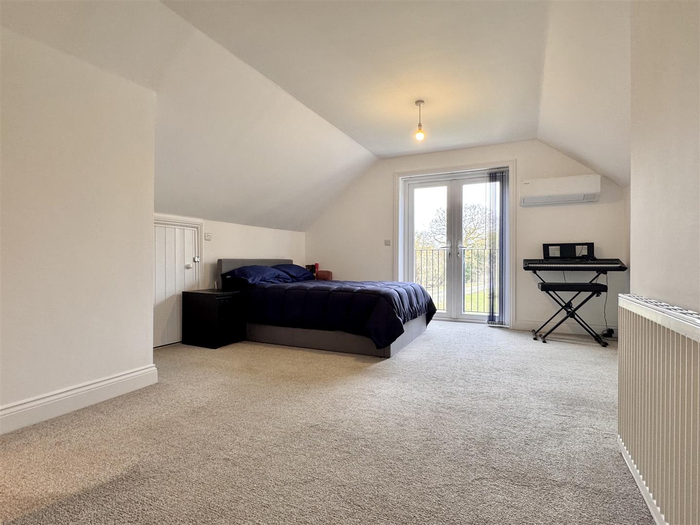 Double glazed window to side aspect, adjacent dressing room with a series of built-in wardrobes, wall-mounted air conditioning unit, radiator, carpeted flooring.