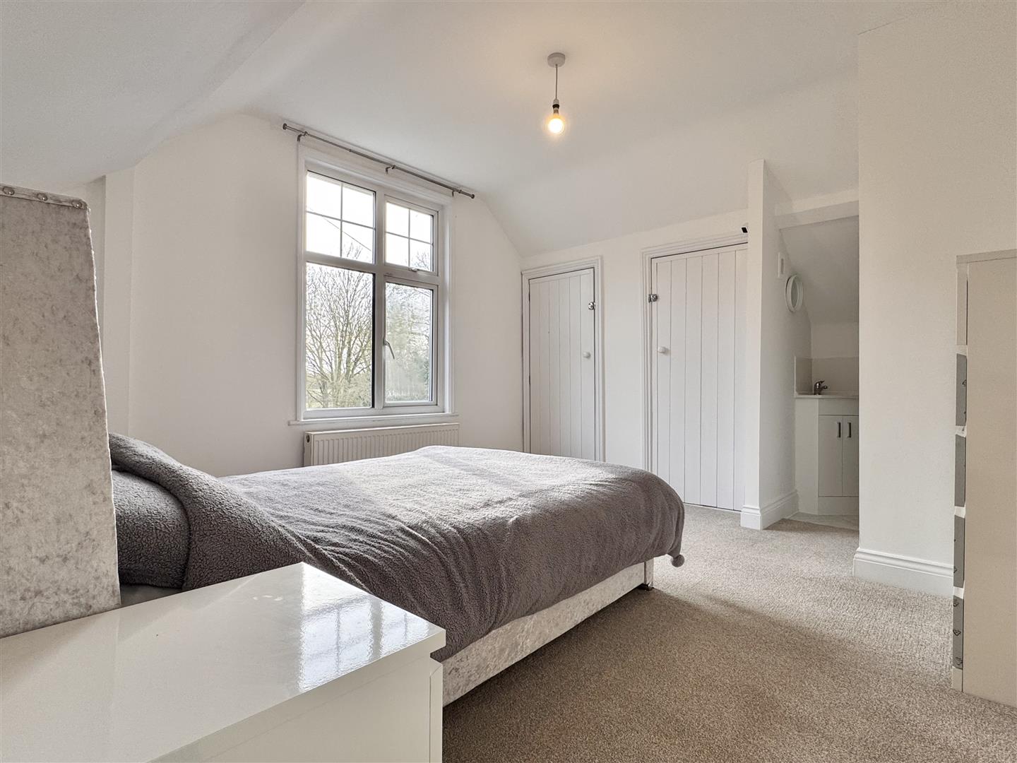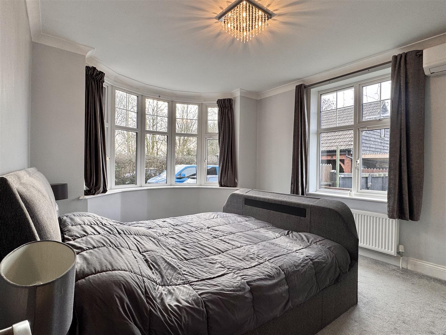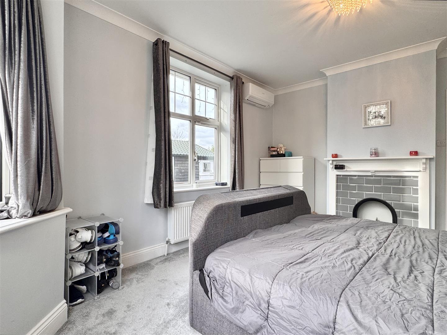 Bedroom Three: - 4.27m x 3.48m (14'0 x 11'5) - Double glazed bay window to front aspect and double glazed window to side aspect, feature fireplace, wall-mounted air conditioning unit, radiator, carpeted flooring.