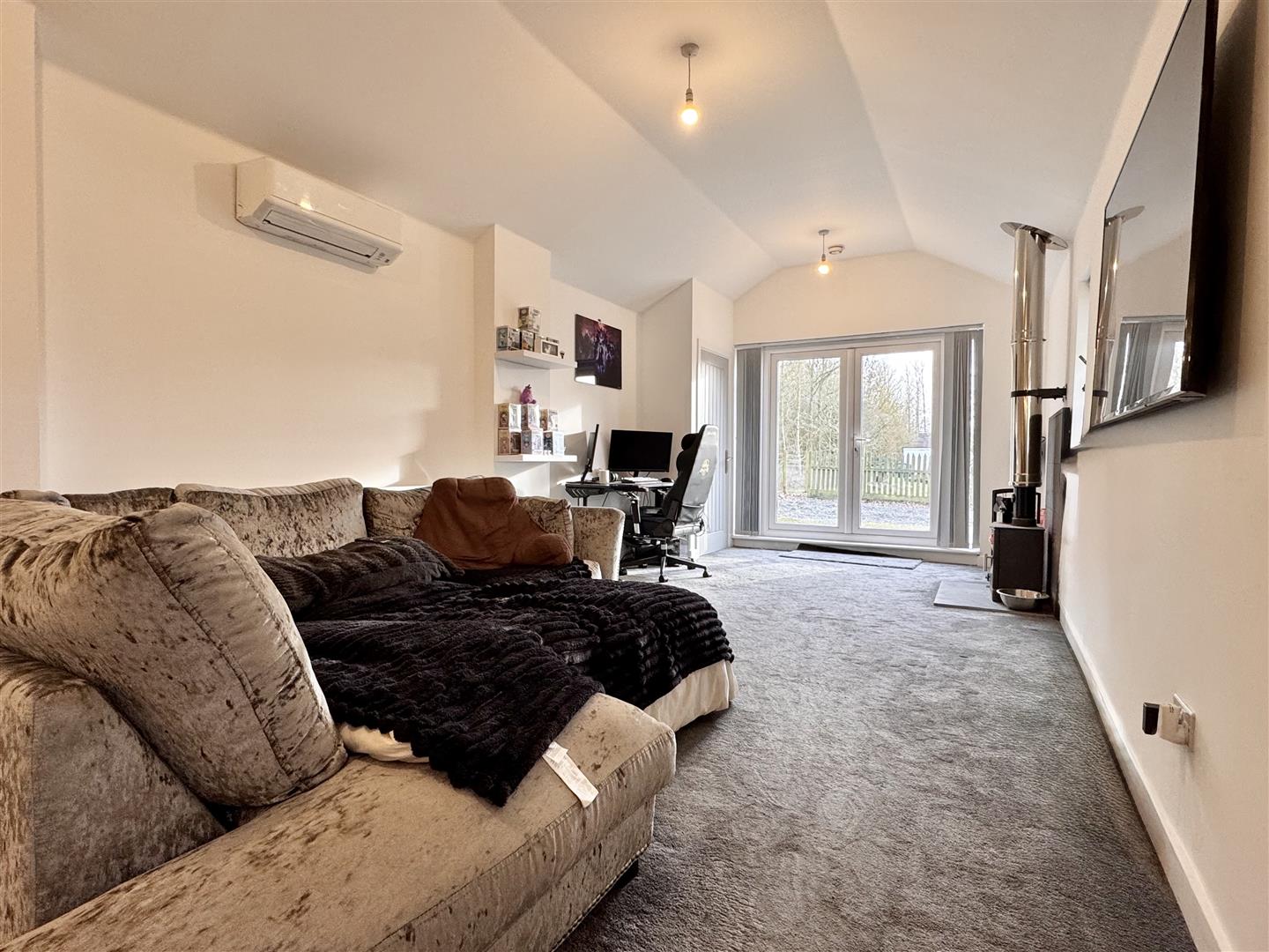 Lounge: - 5.26m x 4.09m (17'3 x 13'5) - Double glazed window to side aspect, log burner, wall-mounted air conditioning unit, radiator, carpeted flooring. bi-folding doors across rear aspect.