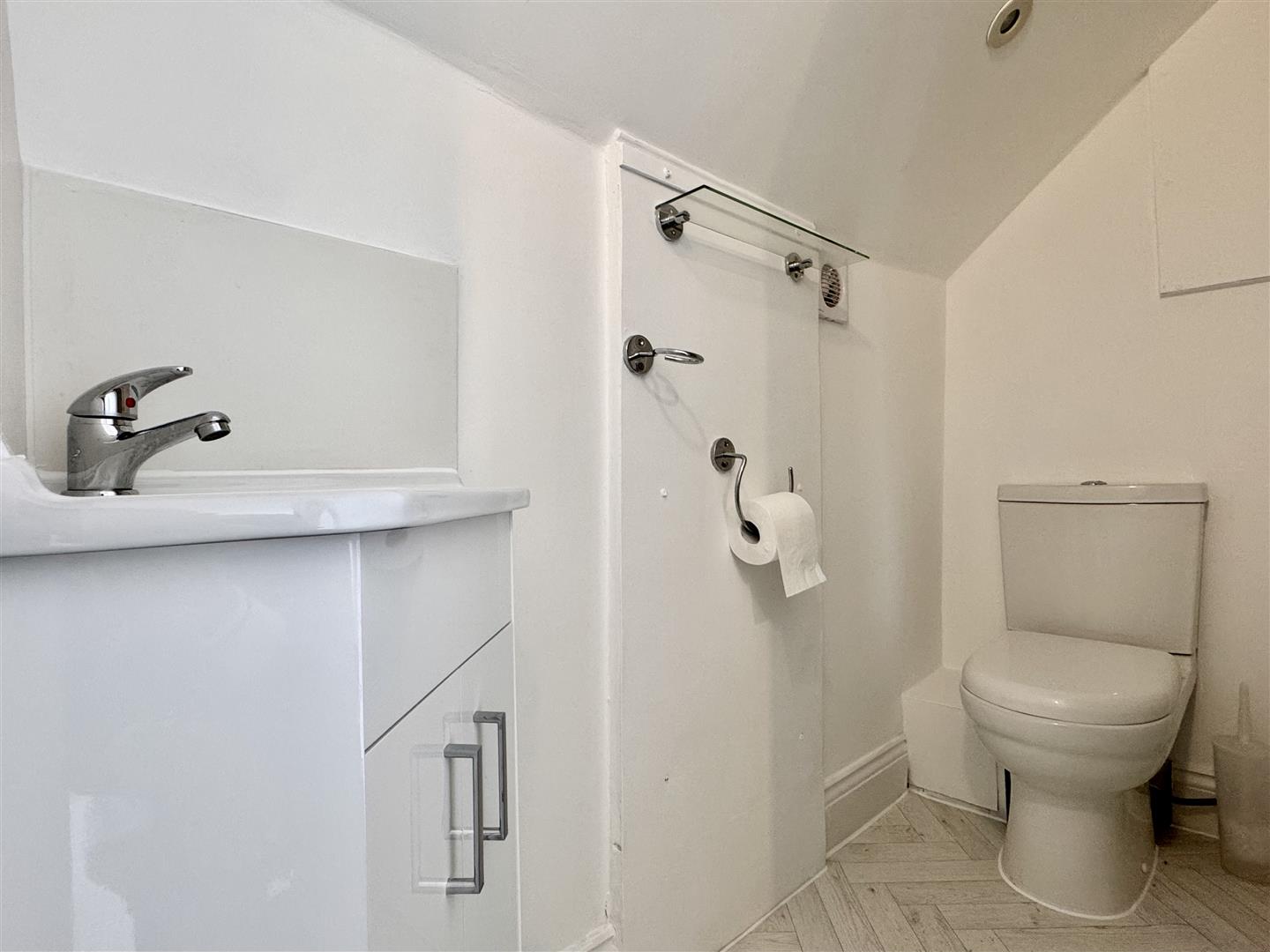 En-Suite: - Enclosed and fully tiled single shower unit, low level WC, vanity wash hand basin with tiled splash back, extractor fan, vinyl flooring.