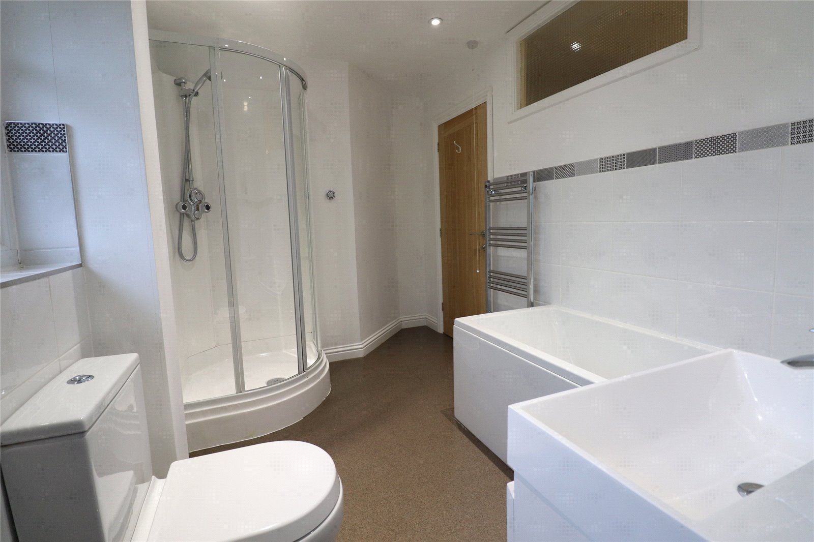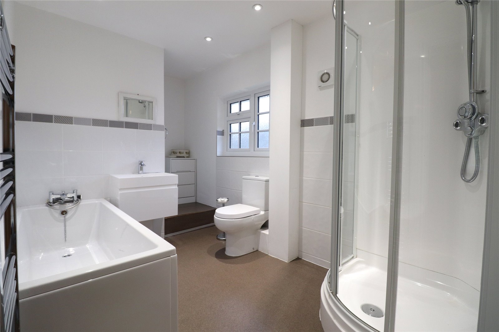 Bathroom 12'3" (3.73m) x 7'2" (2.18m) max dimensions. Fitted with a white four piece suite comprising panel bath with chrome mixer tap shower attachment over, floating rectangular sink with chrome mixer tap over set onto a pull out drawer, low level WC and corner shower cubicle with chrome power shower over with control on/off button to the outside, tiling to water sensitive areas, inset spotlights, chrome heated towel rail, extractor fan, frosted Upvc double glazed window to front aspect with tiled sill, internal feature window light to one wall.