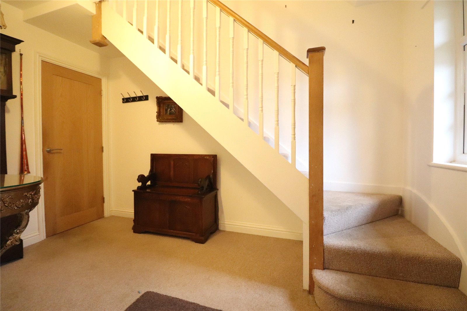 Entrance Hall 12' x 7'4" (3.66m x 2.24m). A spacious entrance hall with stairs rising to first floor with exposed wooden handrail and posts and painted spindles with open space under, double panel radiator, smoke alarm, Upvc double glazed window to front aspect, oak doors to kitchen and:-