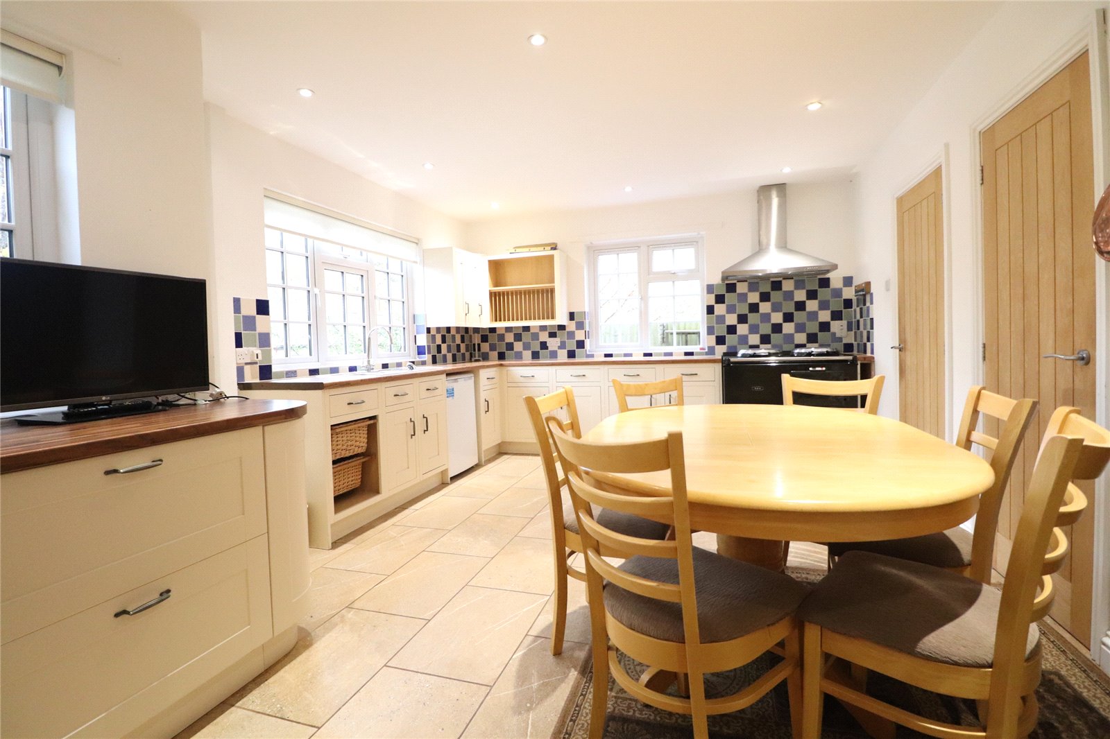 Kitchen Diner 19'3" x 12'8" max (5.87m x 3.86m max). A fabulous dual aspect kitchen/diner/family room offering ample space for entertaining. The room has been fully refitted and comprises of a range of cream Shaker style soft closing eye and base level units with dark wood effect rolled edge work surfaces over. The base units are majority drawer line and include two wide pan drawers and an open unit with pull out wicker baskets for vegetable storage and a curved end unit, whilst the wall units to one corner include an open display shelf with plate rack under. Inset stainless steel one and a half bowl single drainer sink unit with chrome swan neck mixer tap over, space for dishwasher, space for full height fridge/freezer. The kitchen has been enhanced by the addition of an electric Aga two oven range cooker which has a boiling plate and simmering plate, plus a roasting oven and simmering oven with contemporary stainless steel chimney style extractor fan over. Tiling to water sensitive areas, two Upvc double glazed windows to front aspect, one with tiled sill Upvc double glazed window to side aspect with tiled sill, stone effect tiled flooring, alcove to one wall set into the chimney breast with oak door to one side giving access to the airing cupboard housing the hot water cylinder and slatted linen shelving, double panel radiator, inset spotlights, ample space for table and chairs, oak door to: