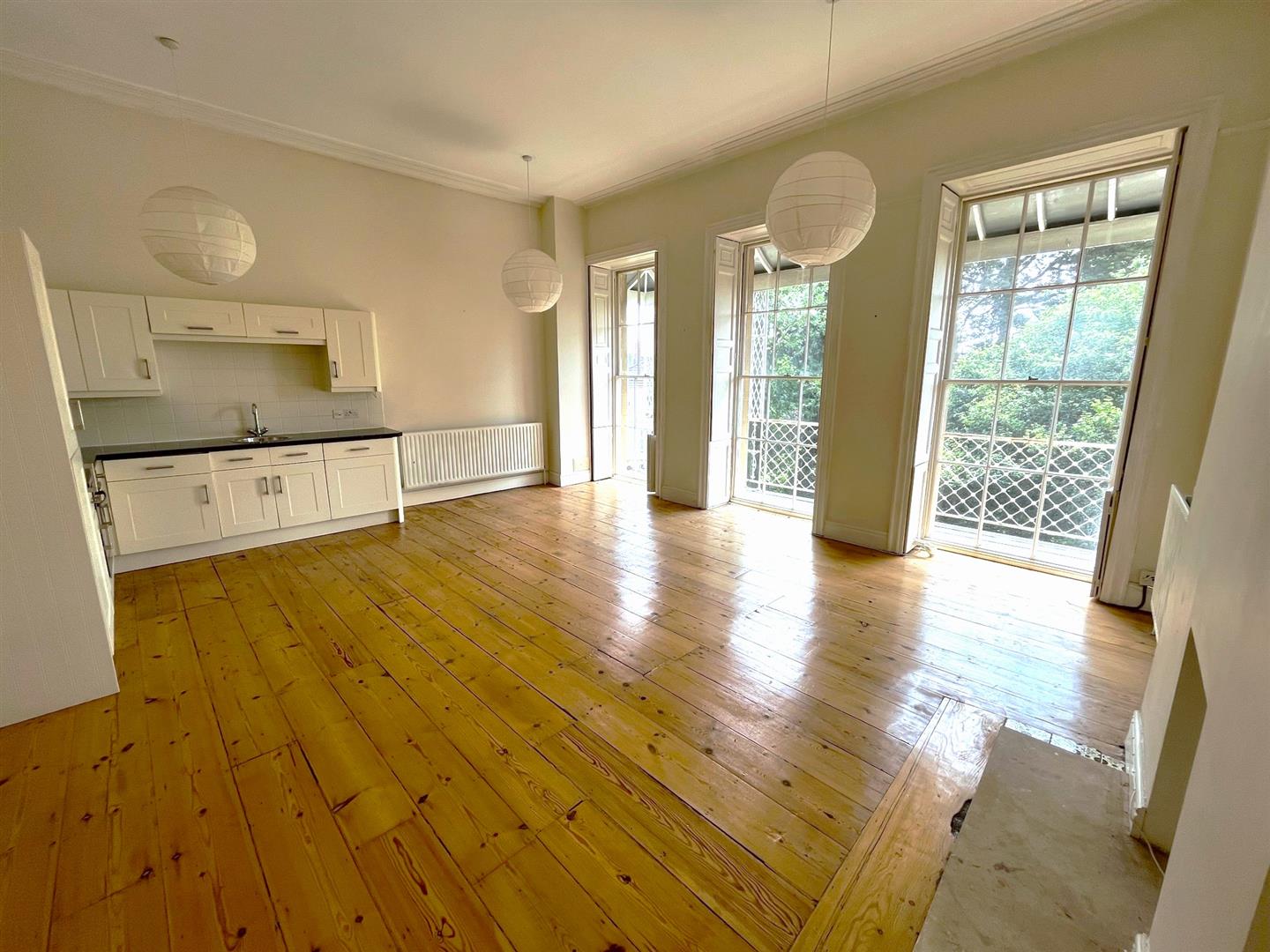 The large sash windows give access to the charming full width balcony with attractive ironwork and canope, and allow natural light to cascade into the principle living room, creating a light and bright environment. Although open plan, the living room divides informally as the well appointed modern fitted kitchen occupies one corner of the room offering plentiful space for dining and sitting areas, which enjoy the light flooding through the beautiful sash windows..