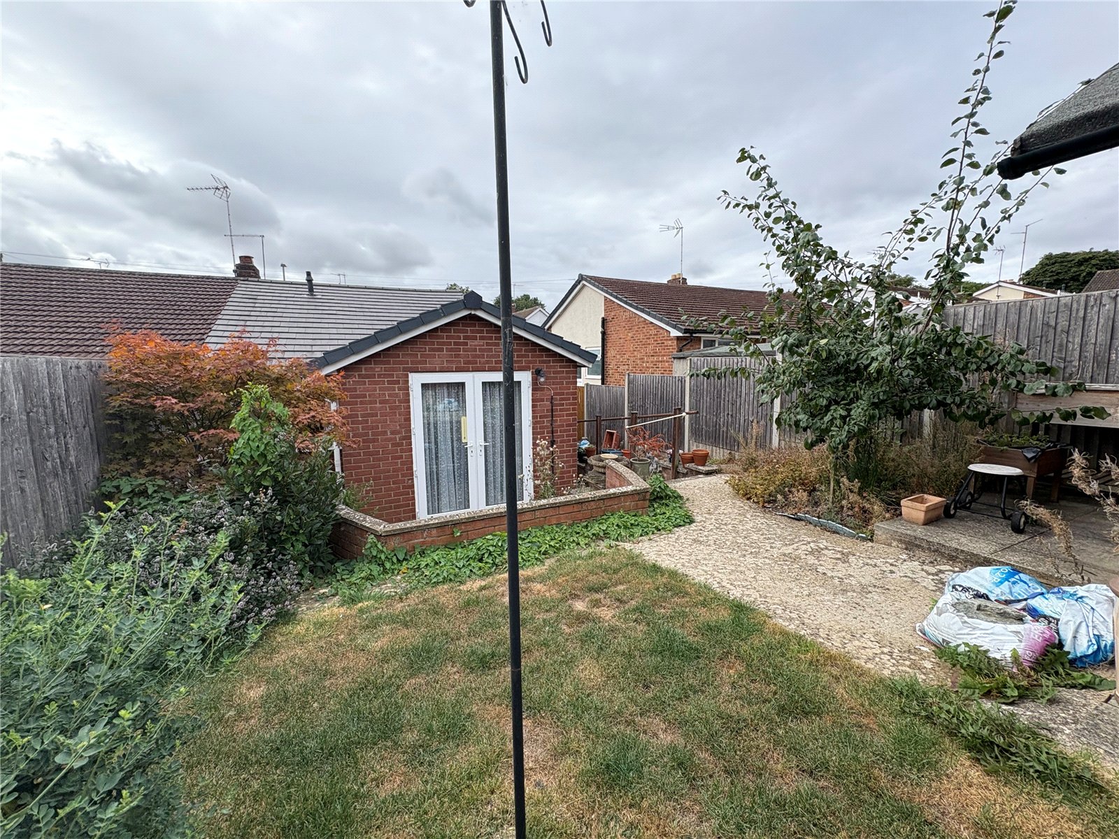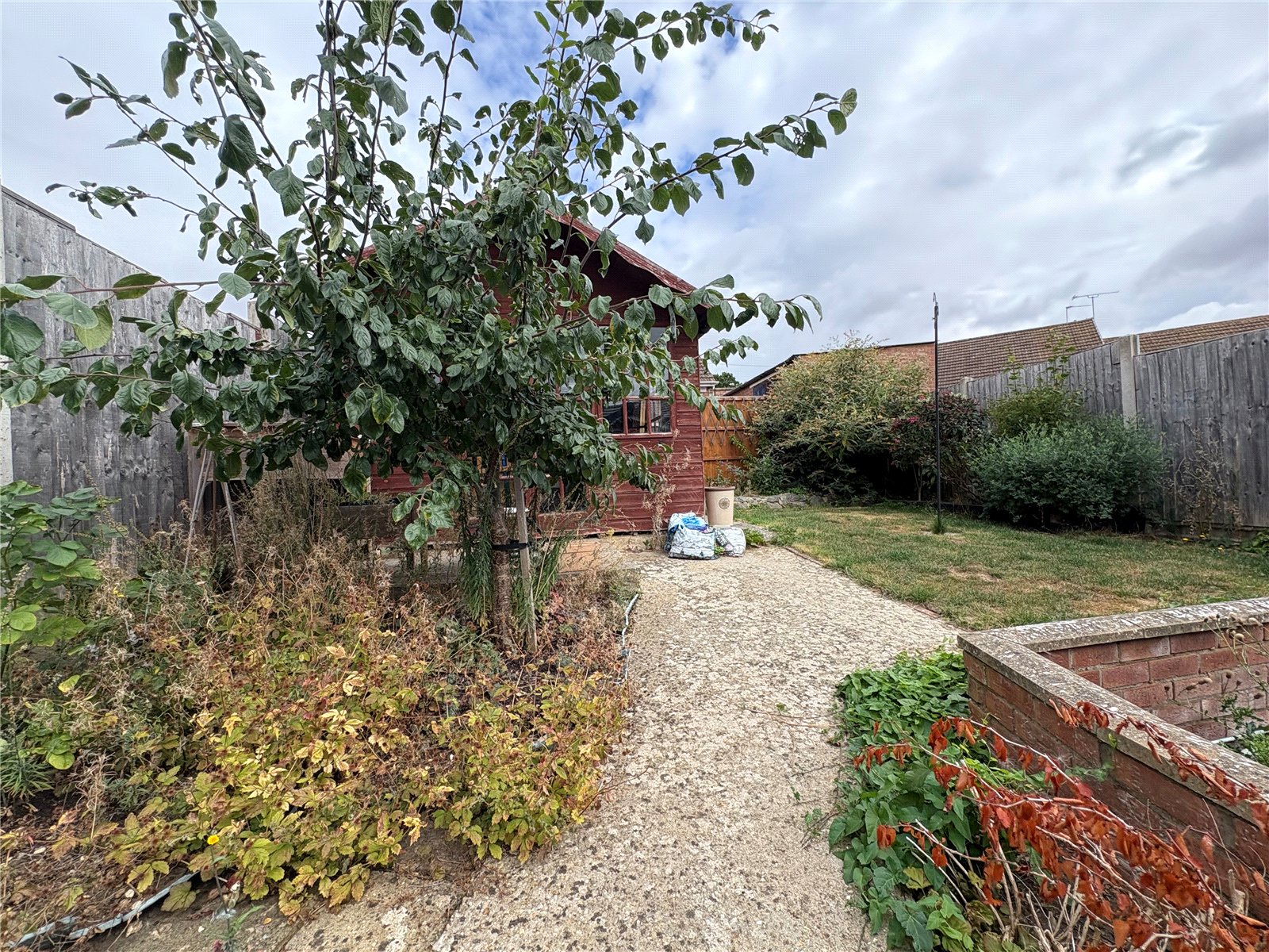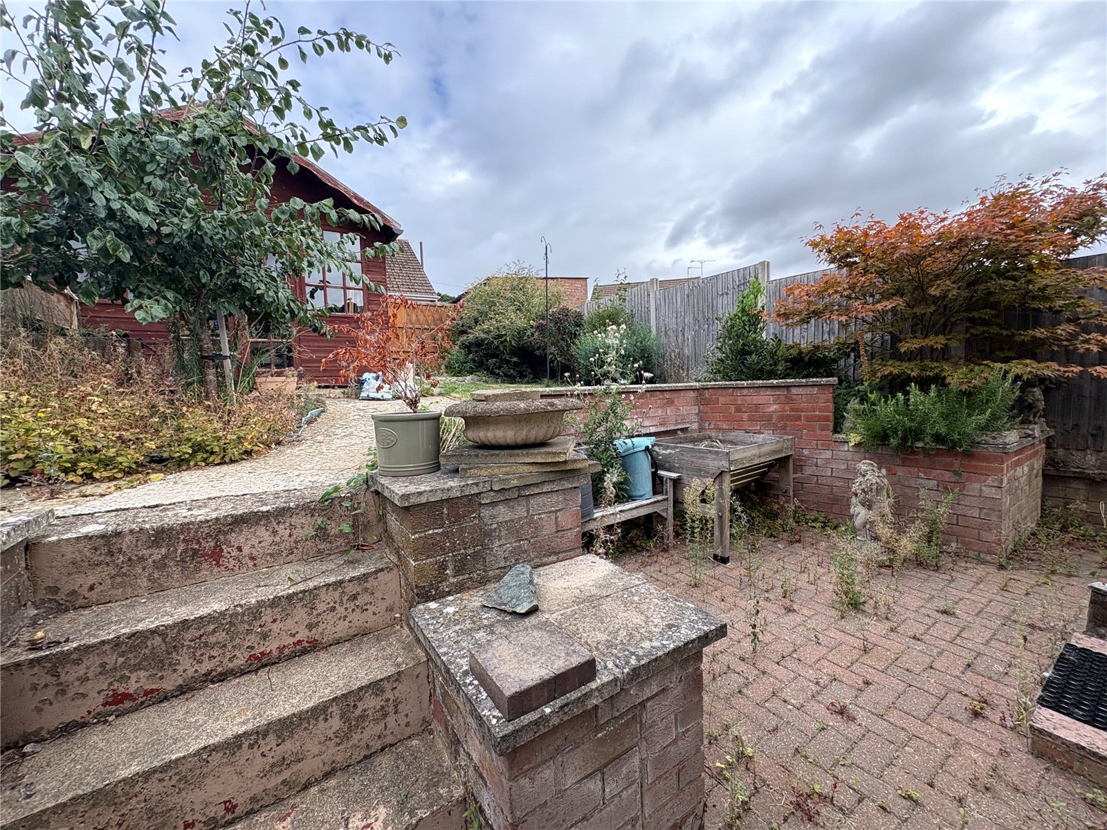 Rear A tiered garden with the lower section being paved and with steps leading to the upper tier with a timber summer house, lawned and gravelled areas and a variety of planted shrubs. The garden is enclosed by timber fencing.