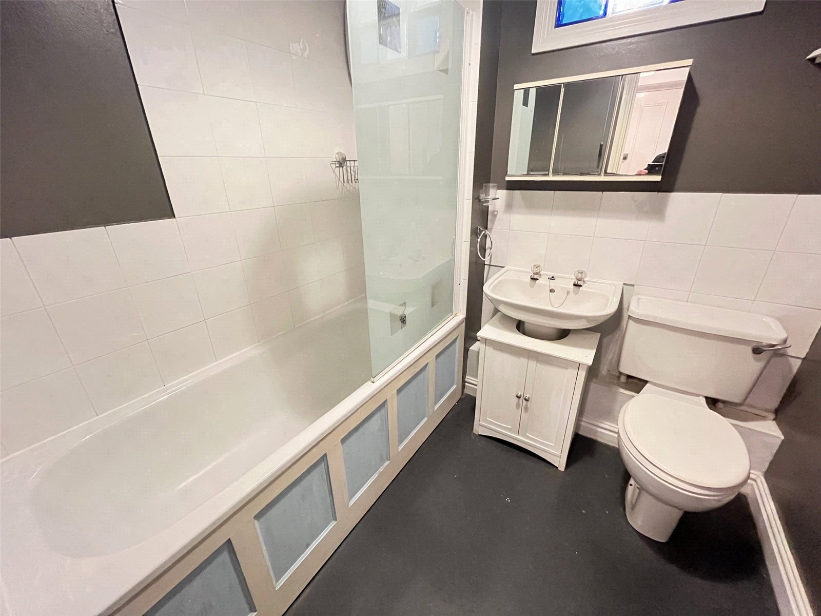 Bathroom 6'8" x 6'4" (2.03m x 1.93m). Fitted with a white three piece suite comprising of low level WC, pedestal wash hand basin, panel bath with electric shower over and glass shower screen, tiling to water sensitive areas, extractor fan