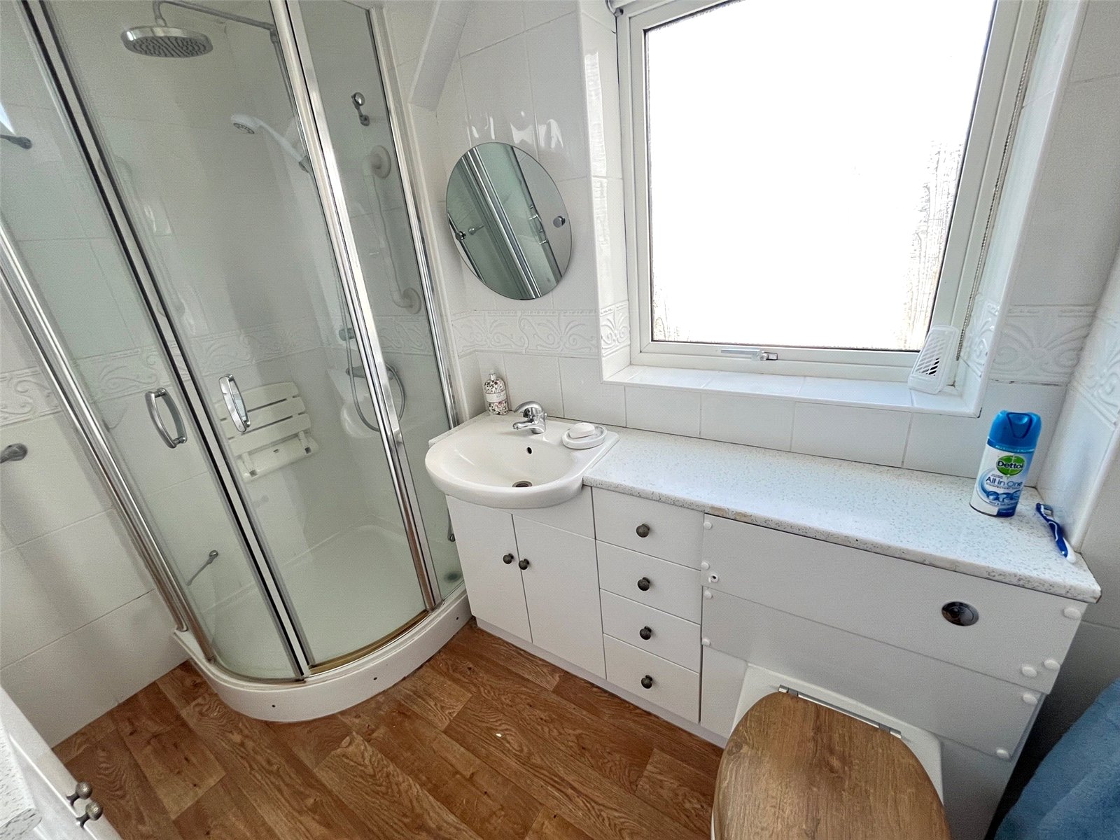 Shower Room 8'6" (2.6m) x 5'6" (1.68m) Plus Recess. Fitted with a white three piece suite comprising of concealed unit WC, wash hand basin with mixer tap over set into vanity unit, shower cubicle with plumbed in shower with oversized shower head and further shower attachment, curved shower screen, full height tiling to all walls, eye and base level storage units, opaque Upvc double glazed window to rear aspect, opaque Upvc double gazed window to side aspect, shaver point, chrome heated towel rail